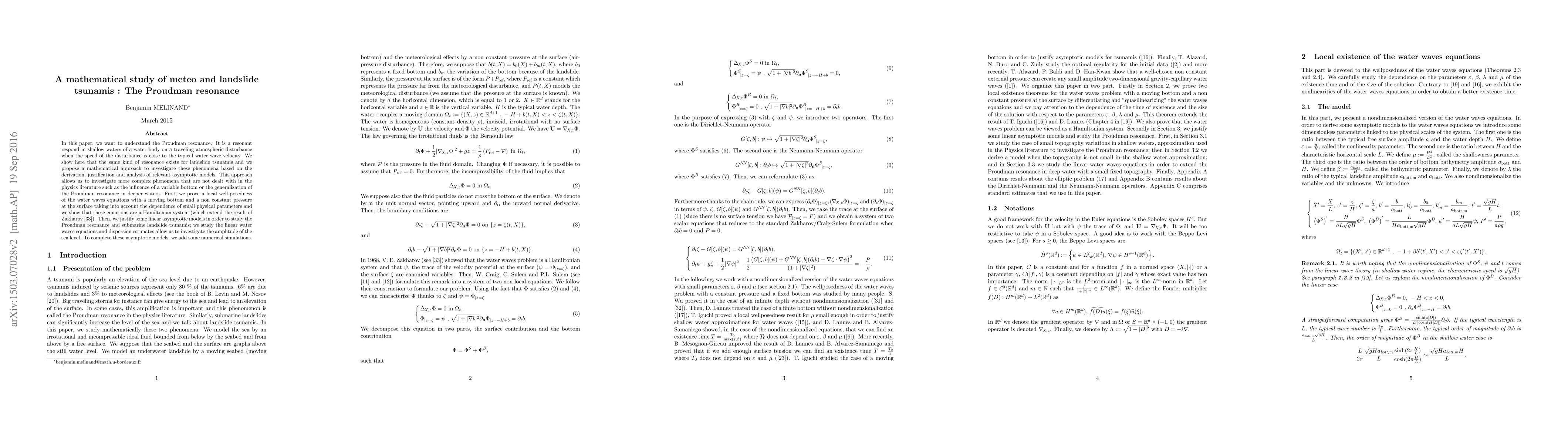 In this paper, we want to understand the Proudman resonance. It is a resonant respond in shallow waters of a water body on a traveling atmospheric disturbance when the speed of the disturbance is close to the typical water wave velocity. We show here that the same kind of resonance exists for landslide tsunamis and we propose a mathematical approach to investigate these phenomena based on the derivation, justification and analysis of relevant asymptotic models. This approach allows us to investigate more complex phenomena that are not dealt with in the physics literature such as the influence of a variable bottom or the generalization of the Proudman resonance in deeper waters. First, we prove a local well-posedness of the water waves equations with a moving bottom and a non constant pressure at the surface taking into account the dependence of small physical parameters and we show that these equations are a Hamiltonian system (which extend the result of Zakharov [33]). Then, we justify some linear asymptotic models in order to study the Proudman resonance and submarine landslide tsunamis; we study the linear water waves equations and dispersion estimates allow us to investigate the amplitude of the sea level. To complete these asymptotic models, we add some numerical simulations.