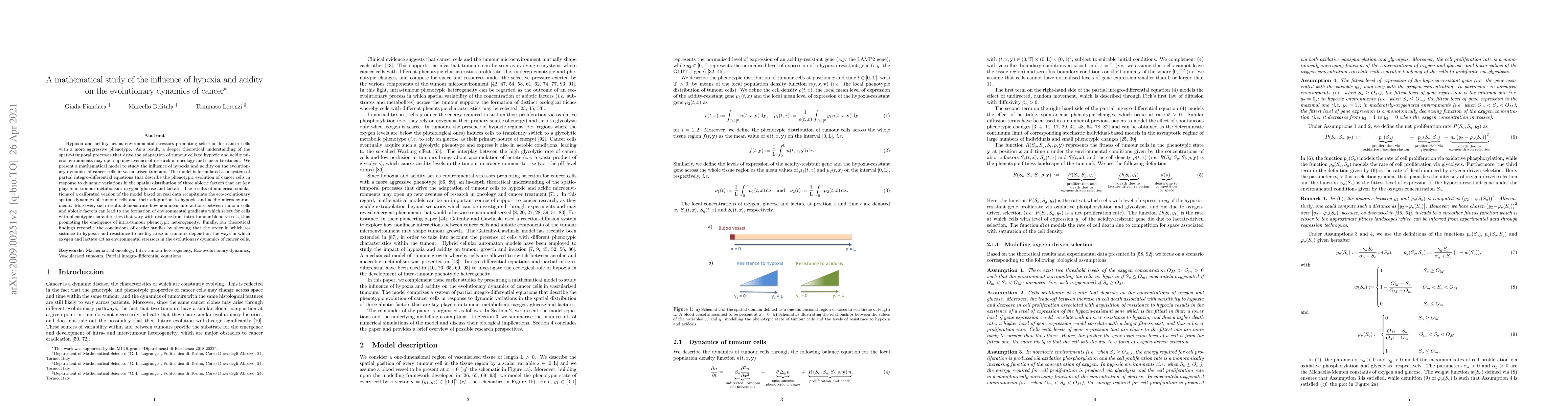 This paper presents a mathematical model to explore how hypoxia and acidity influence the evolutionary dynamics of cancer cells in vascularized tumours, using partial integro-differential equations to describe the phenotypic adaptation of tumour cells to varying oxygen, glucose, and lactate levels. The model's simulations reveal the formation of intra-tumour phenotypic heterogeneity driven by nonlinear interactions between tumour cells and their environment.