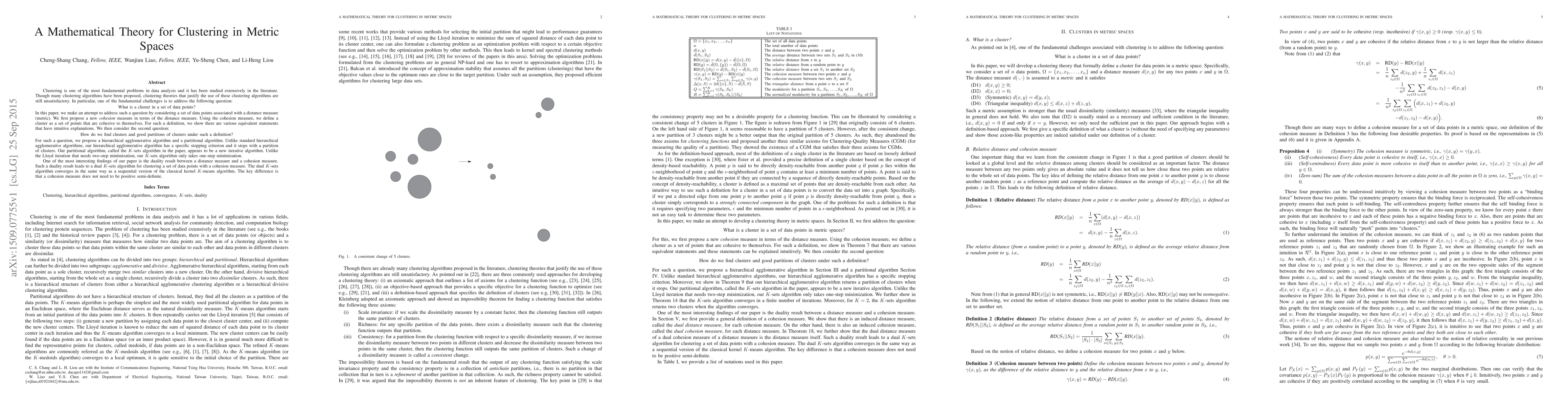 This paper proposes a mathematical theory to define clusters in metric spaces using a new cohesion measure. It introduces algorithms for finding clusters, including a hierarchical agglomerative method and a novel K-sets partitional algorithm, and highlights a duality result between distance and cohesion measures leading to a dual K-sets algorithm.