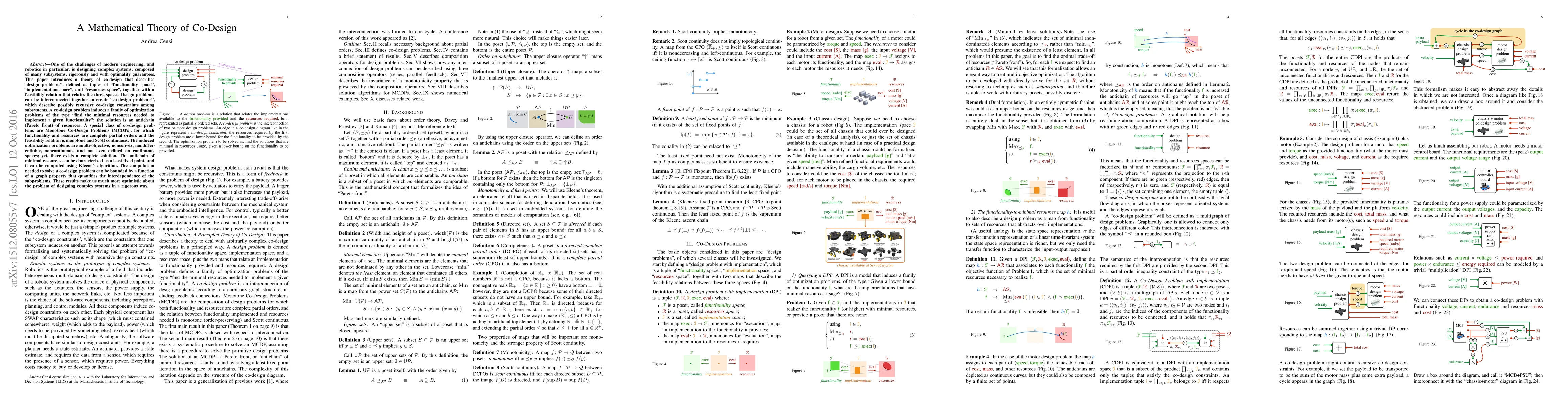One of the challenges of modern engineering, and robotics in particular, is designing complex systems, composed of many subsystems, rigorously and with optimality guarantees. This paper introduces a theory of co-design that describes "design problems", defined as tuples of "functionality space", "implementation space", and "resources space", together with a feasibility relation that relates the three spaces. Design problems can be interconnected together to create "co-design problems", which describe possibly recursive co-design constraints among subsystems. A co-design problem induces a family of optimization problems of the type "find the minimal resources needed to implement a given functionality"; the solution is an antichain (Pareto front) of resources. A special class of co-design problems are Monotone Co-Design Problems (MCDPs), for which functionality and resources are complete partial orders and the feasibility relation is monotone and Scott continuous. The induced optimization problems are multi-objective, nonconvex, nondifferentiable, noncontinuous, and not even defined on continuous spaces; yet, there exists a complete solution. The antichain of minimal resources can be characterized as a least fixed point, and it can be computed using Kleene's algorithm. The computation needed to solve a co-design problem can be bounded by a function of a graph property that quantifies the interdependence of the subproblems. These results make us much more optimistic about the problem of designing complex systems in a rigorous way.