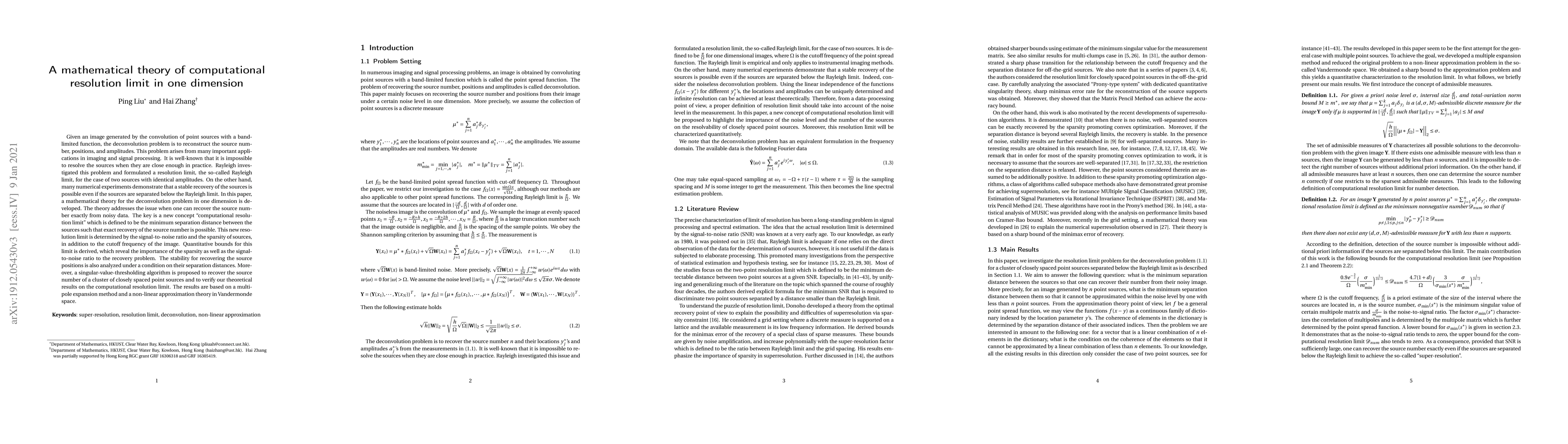 This paper develops a mathematical theory for the deconvolution problem in one dimension, introducing the concept of "computational resolution limit" to determine the minimum separation distance for exact recovery of source number from noisy data. The theory highlights the roles of signal-to-noise ratio and source sparsity, providing quantitative bounds and proposing a singular-value-thresholding algorithm for practical recovery.
