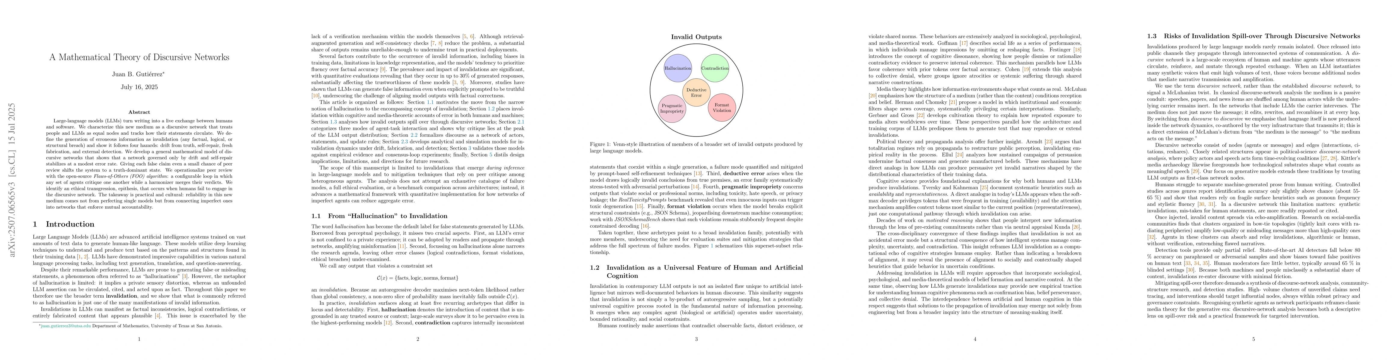 Large-language models (LLMs) turn writing into a live exchange between humans and software. We characterize this new medium as a discursive network that treats people and LLMs as equal nodes and tracks how their statements circulate. We define the generation of erroneous information as invalidation (any factual, logical, or structural breach) and show it follows four hazards: drift from truth, self-repair, fresh fabrication, and external detection. We develop a general mathematical model of discursive networks that shows that a network governed only by drift and self-repair stabilizes at a modest error rate. Giving each false claim even a small chance of peer review shifts the system to a truth-dominant state. We operationalize peer review with the open-source \emph{Flaws-of-Others (FOO) algorithm}: a configurable loop in which any set of agents critique one another while a harmonizer merges their verdicts. We identify an ethical transgression, epithesis, that occurs when humans fail to engage in the discursive network. The takeaway is practical and cultural: reliability in this new medium comes not from perfecting single models but from connecting imperfect ones into networks that enforce mutual accountability.