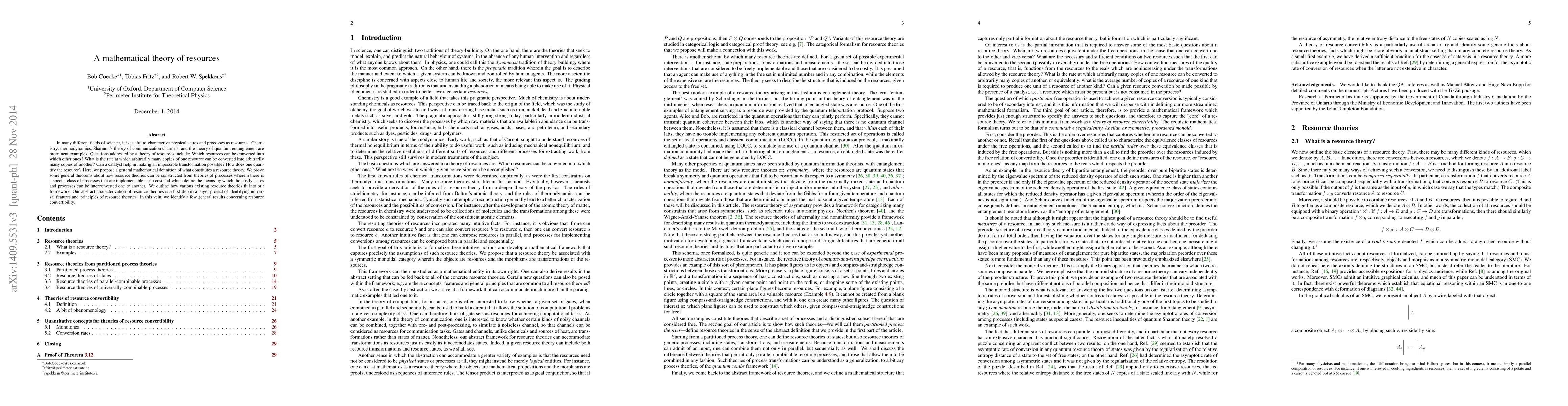 In many different fields of science, it is useful to characterize physical states and processes as resources. Chemistry, thermodynamics, Shannon's theory of communication channels, and the theory of quantum entanglement are prominent examples. Questions addressed by a theory of resources include: Which resources can be converted into which other ones? What is the rate at which arbitrarily many copies of one resource can be converted into arbitrarily many copies of another? Can a catalyst help in making an impossible transformation possible? How does one quantify the resource? Here, we propose a general mathematical definition of what constitutes a resource theory. We prove some general theorems about how resource theories can be constructed from theories of processes wherein there is a special class of processes that are implementable at no cost and which define the means by which the costly states and processes can be interconverted one to another. We outline how various existing resource theories fit into our framework. Our abstract characterization of resource theories is a first step in a larger project of identifying universal features and principles of resource theories. In this vein, we identify a few general results concerning resource convertibility.