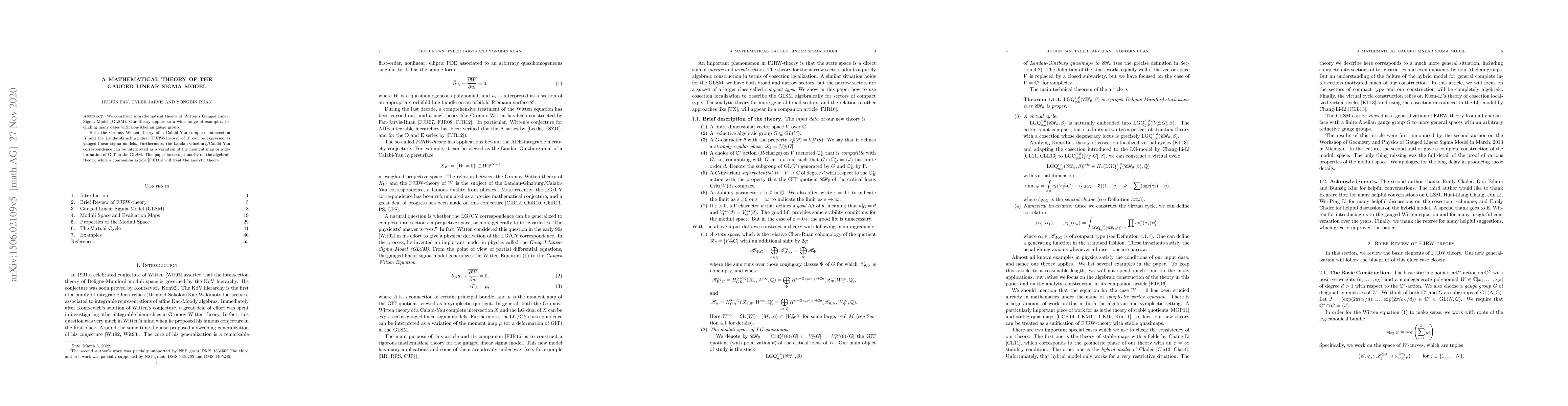 We construct a mathematical theory of Witten's Gauged Linear Sigma Model (GLSM). Our theory applies to a wide range of examples, including many cases with non-Abelian gauge group. Both the Gromov-Witten theory of a Calabi-Yau complete intersection X and the Landau-Ginzburg dual (FJRW-theory) of X can be expressed as gauged linear sigma models. Furthermore, the Landau-Ginzburg/Calabi-Yau correspondence can be interpreted as a variation of the moment map or a deformation of GIT in the GLSM. This paper focuses primarily on the algebraic theory, while a companion article will treat the analytic theory.