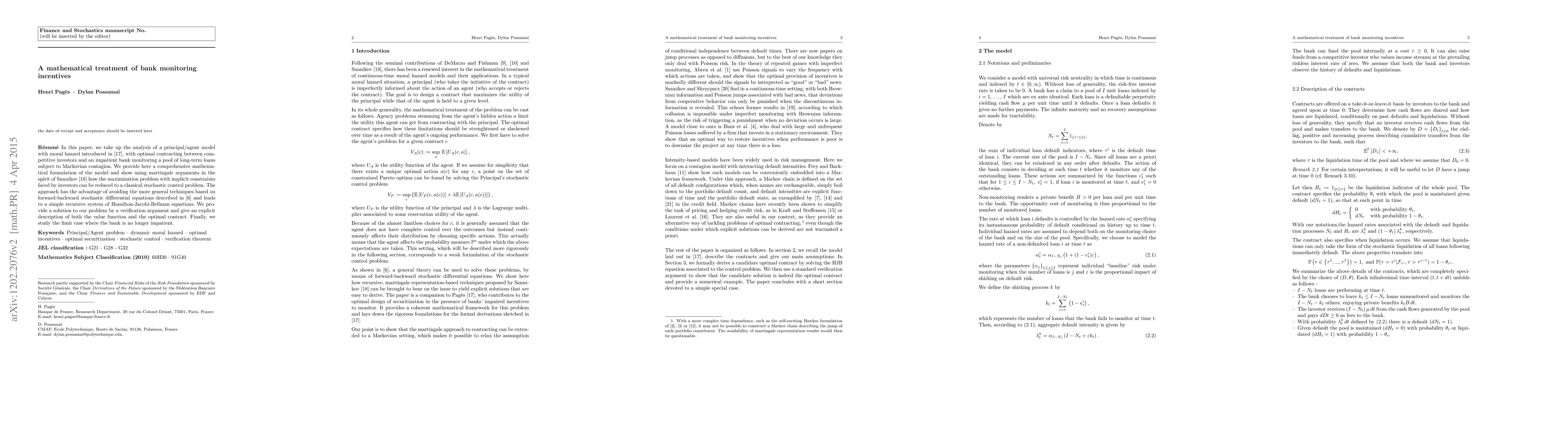 In this paper, we take up the analysis of a principal/agent model with moral hazard introduced in [17], with optimal contracting between competitive investors and an impatient bank monitoring a pool of long-term loans subject to Markovian contagion. We provide here a comprehensive mathematical formulation of the model and show using martingale arguments in the spirit of Sannikov [18] how the maximization problem with implicit constraints faced by investors can be reduced to a classical stochastic control problem. The approach has the advantage of avoiding the more general techniques based on forward-backward stochastic differential equations described in [6] and leads to a simple recursive system of Hamilton-Jacobi-Bellman equations. We provide a solution to our problem by a verification argument and give an explicit description of both the value function and the optimal contract. Finally, we study the limit case where the bank is no longer impatient.