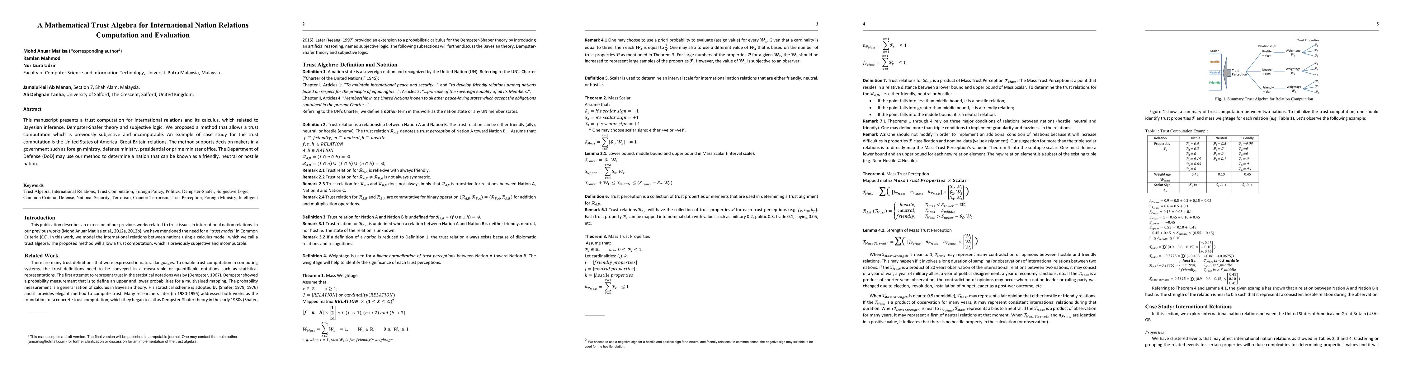 This paper presents a trust computation for international relations and its calculus, which related to Bayesian inference, Dempster Shafer theory and subjective logic. We proposed a method that allows a trust computation which is previously subjective and incomputable. An example of case study for the trust computation is the United States of America Great Britain relations. The method supports decision makers in a government such as foreign ministry, defense ministry, presidential or prime minister office. The Department of Defense (DoD) may use our method to determine a nation that can be known as a friendly, neutral or hostile nation.