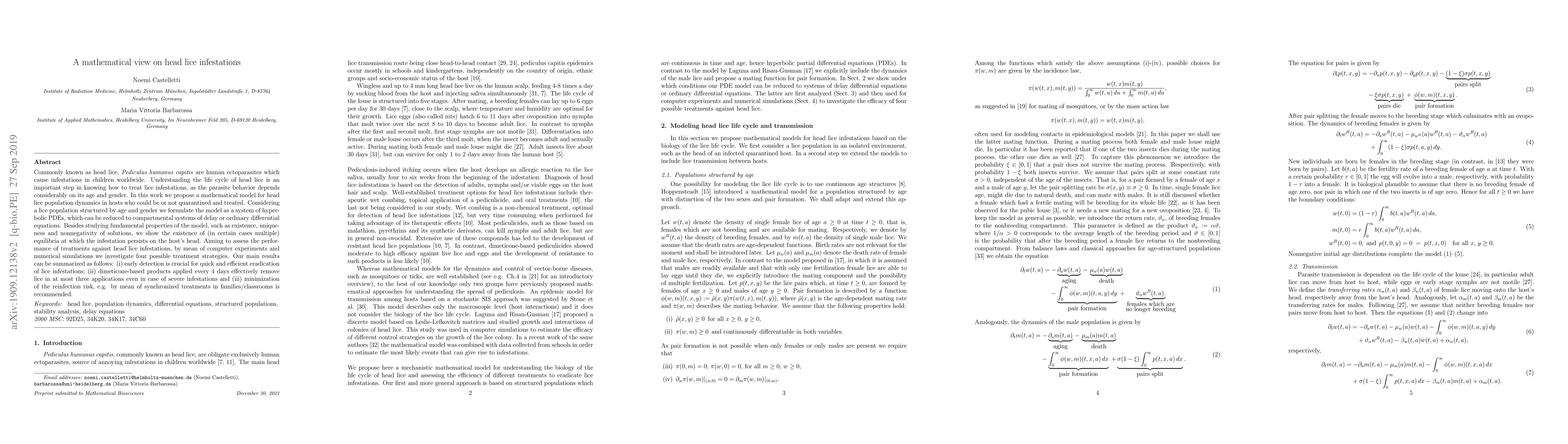 Commonly known as head lice, Pediculus humanus capitis are human ectoparasites which cause infestations in children worldwide. Understanding the life cycle of head lice is an important step in knowing how to treat lice infestations, as the parasite behavior depends considerably on its age and gender. In this work we propose a mathematical model for head lice population dynamics in hosts who could be or not quarantined and treated. Considering a lice population structured by age and gender we formulate the model as a system of hyperbolic PDEs, which can be reduced to compartmental systems of delay or ordinary differential equations. Besides studying fundamental properties of the model, such as existence, uniqueness and nonnegativity of solutions, we show the existence of (in certain cases multiple) equilibria at which the infestation persists on the host's head. Aiming to assess the performance of treatments against head lice infestations, by mean of computer experiments and numerical simulations we investigate four possible treatment strategies. Our main results can be summarized as follows: (i) early detection is crucial for quick and efficient eradication of lice infestations; (ii) dimeticone-based products applied every 4 days effectively remove lice in at most three applications even in case of severe infestations and (iii) minimization of the reinfection risk, e.g. by mean of synchronized treatments in families/classrooms is recommended.