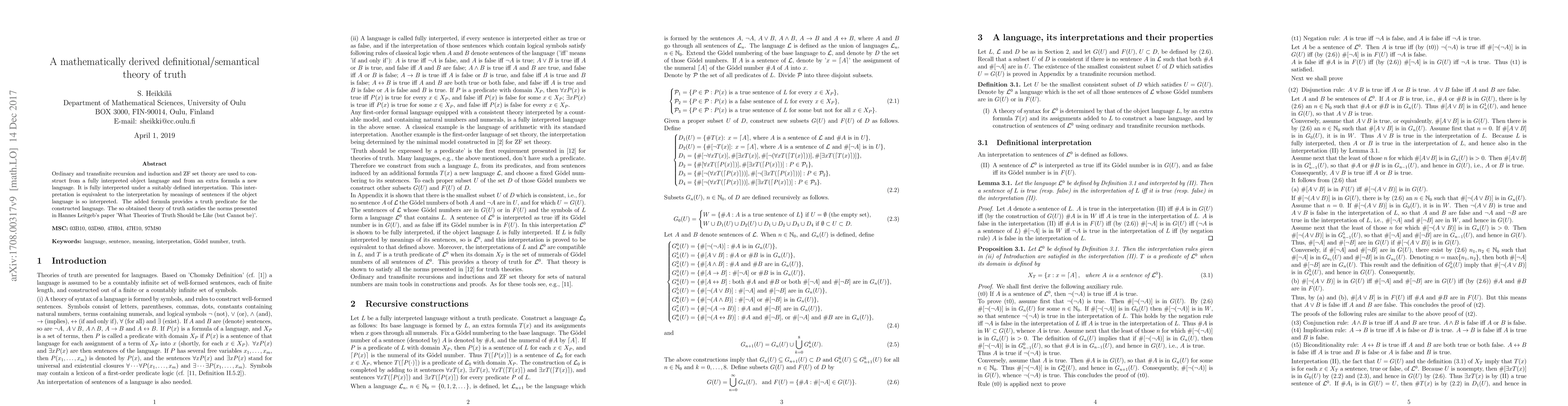 Ordinary and transfinite recursion and induction and ZF set theory are used to construct from a fully interpreted object language and from an extra formula a new language. It is fully interpreted under a suitably defined interpretation. This interpretation is equivalent to the interpretation by meanings of sentences if the object language is so interpreted. The added formula provides a truth predicate for the constructed language. The so obtained theory of truth satisfies the norms presented in Hannes Leitgeb's paper 'What Theories of Truth Should be Like (but Cannot be)'.