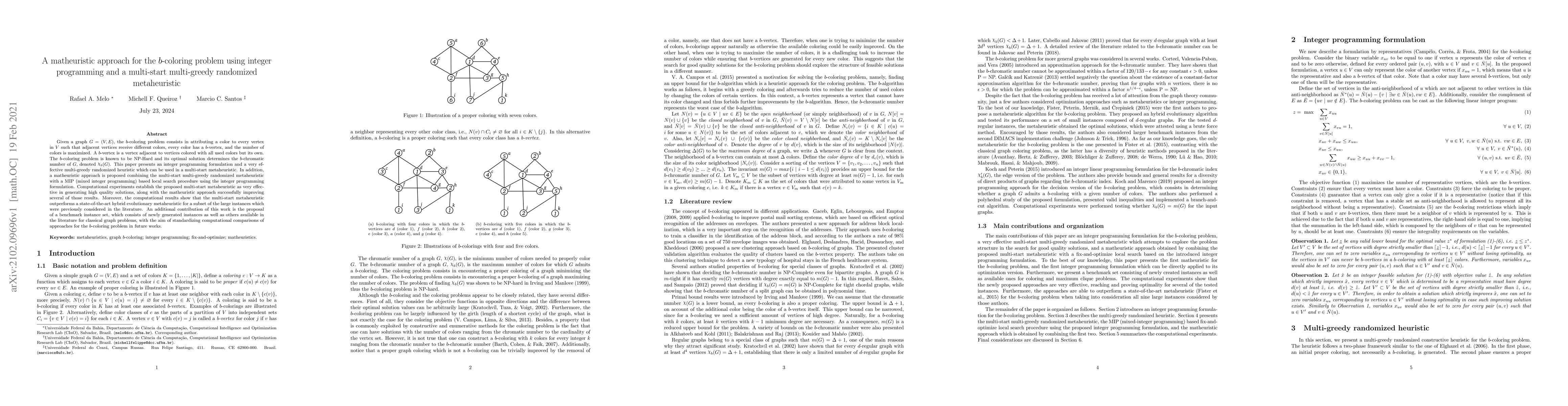 Given a graph $G=(V,E)$, the $b$-coloring problem consists in attributing a color to every vertex in $V$ such that adjacent vertices receive different colors, every color has a $b$-vertex, and the number of colors is maximized. A $b$-vertex is a vertex adjacent to vertices colored with all used colors but its own. The $b$-coloring problem is known to be NP-Hard and its optimal solution determines the $b$-chromatic number of $G$, denoted $\chi_b(G)$. This paper presents an integer programming formulation and a very effective multi-greedy randomized heuristic which can be used in a multi-start metaheuristic. In addition, a matheuristic approach is proposed combining the multi-start multi-greedy randomized metaheuristic with a MIP (mixed integer programming) based local search procedure using the integer programming formulation. Computational experiments establish the proposed multi-start metaheuristic as very effective in generating high quality solutions, along with the matheuristic approach successfully improving several of those results. Moreover, the computational results show that the multi-start metaheuristic outperforms a state-of-the-art hybrid evolutionary metaheuristic for a subset of the large instances which were previously considered in the literature. An additional contribution of this work is the proposal of a benchmark instance set, which consists of newly generated instances as well as others available in the literature for classical graph problems, with the aim of standardizing computational comparisons of approaches for the $b$-coloring problem in future works.