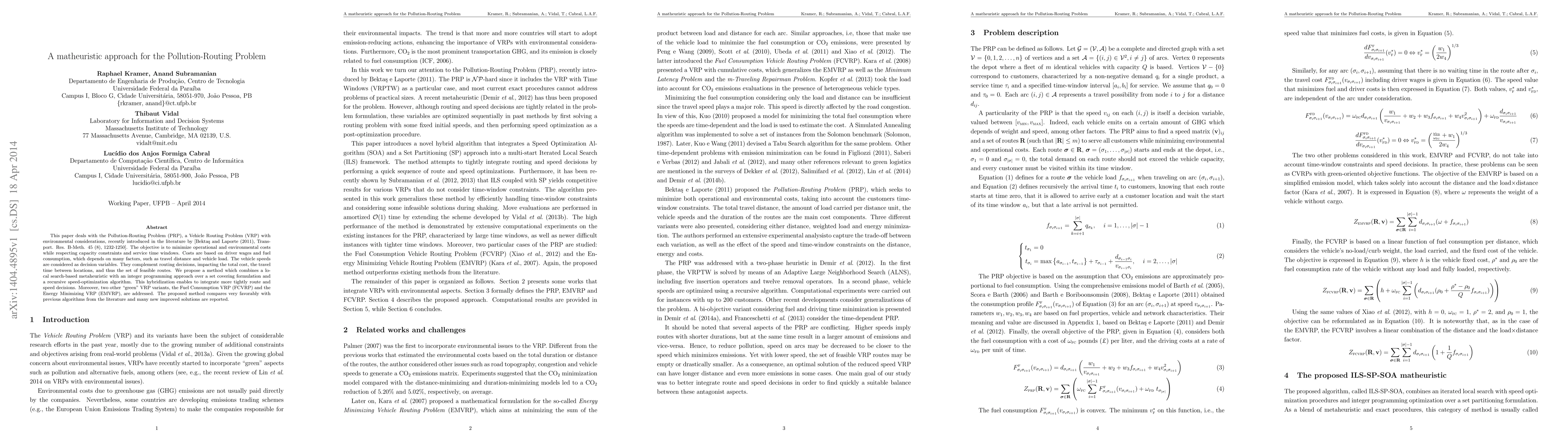 This paper proposes a matheuristic approach combining local search metaheuristics, integer programming, and a speed-optimization algorithm to solve the Pollution-Routing Problem (PRP), aiming to minimize operational and environmental costs while respecting constraints. The method outperforms previous algorithms and finds improved solutions for green Vehicle Routing Problem variants.