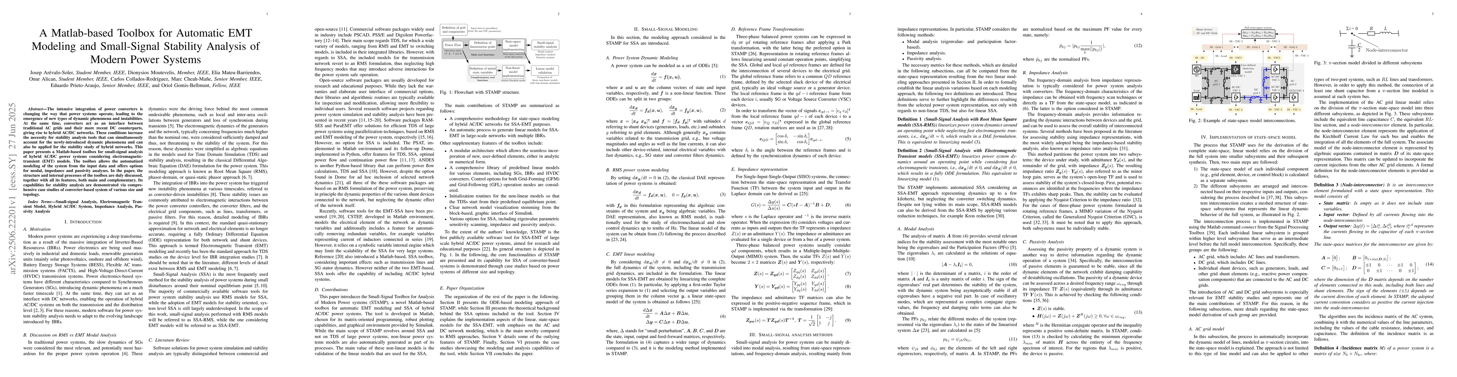 The intensive integration of power converters is changing the way that power systems operate, leading to the emergence of new types of dynamic phenomena and instabilities. At the same time, converters act as an interface between traditional AC grids and their more recent DC counterparts, giving rise to hybrid AC/DC networks. These conditions increase the necessity for stability analysis tools that can simultaneously account for the newly-introduced dynamic phenomena and can also be applied for the stability study of hybrid networks. This paper presents a Matlab-based toolbox for small-signal analysis of hybrid AC/DC power systems considering electromagnetic-transient (EMT) models. The toolbox allows the automatized modeling of the system from the input data and offers options for modal, impedance and passivity analyses. In the paper, the structure and internal processes of the toolbox are duly discussed, together with all its features, both main and complementary. Its capabilities for stability analysis are demonstrated via comprehensive case studies of converter-based system of various size and topology.