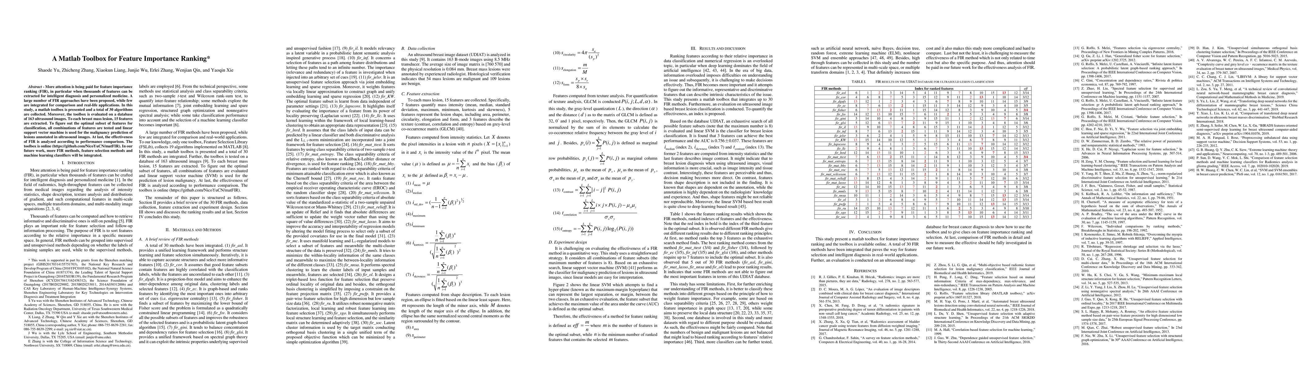 More attention is being paid for feature importance ranking (FIR), in particular when thousands of features can be extracted for intelligent diagnosis and personalized medicine. A large number of FIR approaches have been proposed, while few are integrated for comparison and real-life applications. In this study, a matlab toolbox is presented and a total of 30 algorithms are collected. Moreover, the toolbox is evaluated on a database of 163 ultrasound images. To each breast mass lesion, 15 features are extracted. To figure out the optimal subset of features for classification, all combinations of features are tested and linear support vector machine is used for the malignancy prediction of lesions annotated in ultrasound images. At last, the effectiveness of FIR is analyzed according to performance comparison. The toolbox is online (https://github.com/NicoYuCN/matFIR). In our future work, more FIR methods, feature selection methods and machine learning classifiers will be integrated.