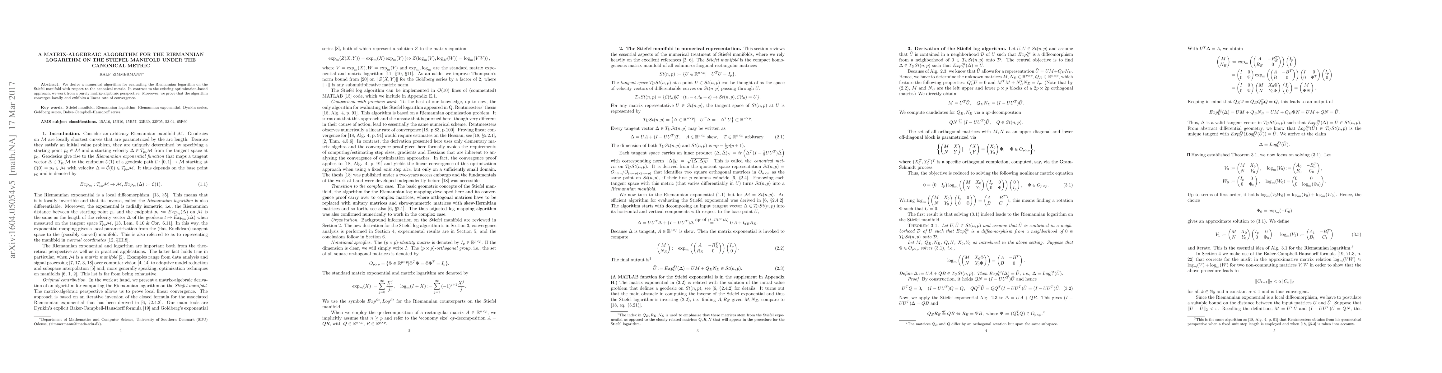 This paper presents a matrix-algebraic algorithm for computing the Riemannian logarithm on the Stiefel manifold using the canonical metric, offering a new approach that diverges from existing optimization-based methods and demonstrating local convergence with a linear rate.