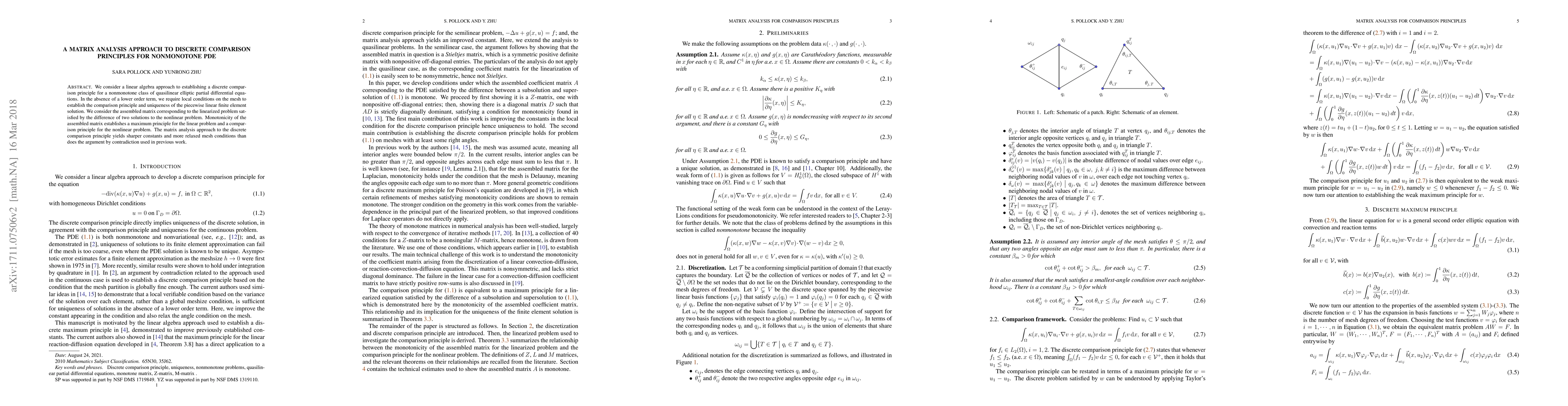 This paper develops a new approach to establishing discrete comparison principles for nonmonotone PDEs, using matrix analysis and local mesh conditions, leading to sharper constants and relaxed mesh requirements.