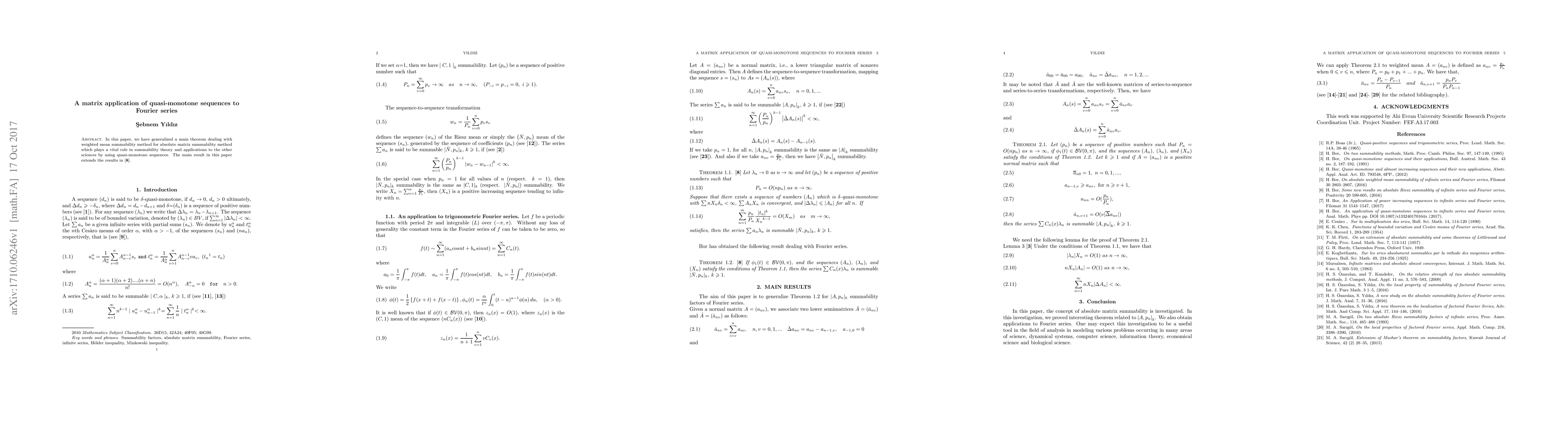 This paper applies quasi-monotone sequences to Fourier series, generalizing a main theorem for absolute matrix summability method with weighted mean summability. It extends previous results in the field of summability theory and its applications.