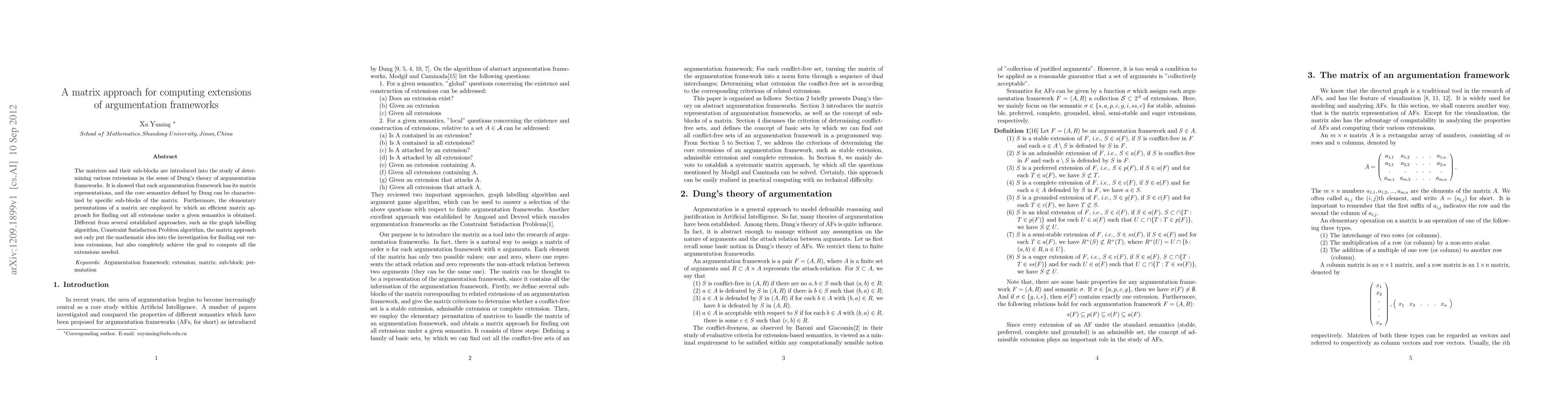 The matrices and their sub-blocks are introduced into the study of determining various extensions in the sense of Dung's theory of argumentation frameworks. It is showed that each argumentation framework has its matrix representations, and the core semantics defined by Dung can be characterized by specific sub-blocks of the matrix. Furthermore, the elementary permutations of a matrix are employed by which an efficient matrix approach for finding out all extensions under a given semantics is obtained. Different from several established approaches, such as the graph labelling algorithm, Constraint Satisfaction Problem algorithm, the matrix approach not only put the mathematic idea into the investigation for finding out various extensions, but also completely achieve the goal to compute all the extensions needed.