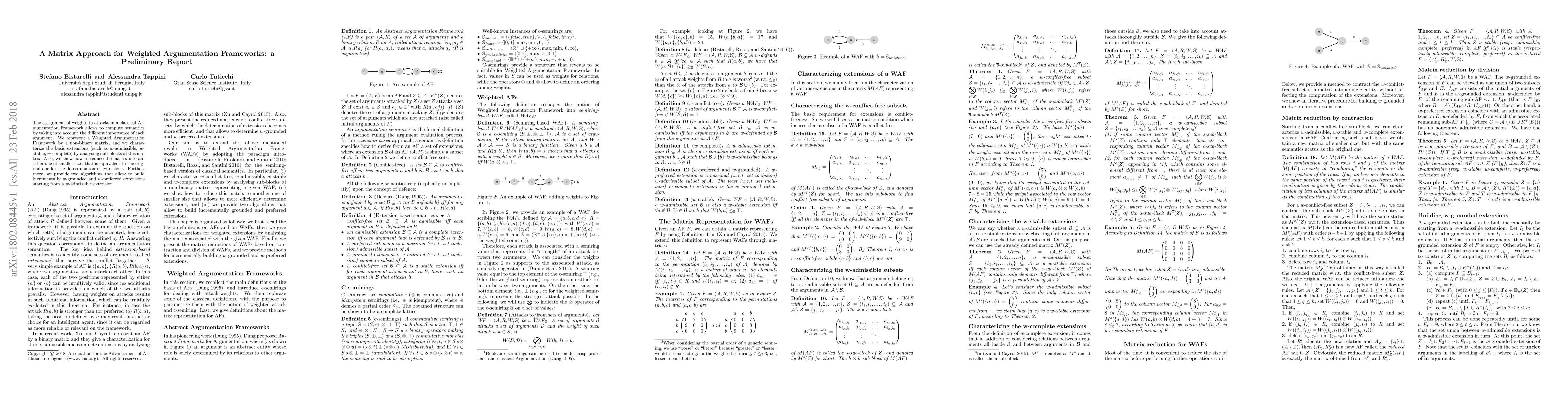 This paper introduces a matrix approach to represent and analyze weighted argumentation frameworks, using non-binary matrices to characterize various extensions. It also presents algorithms for incrementally constructing w-grounded and w-preferred extensions from w-admissible ones.