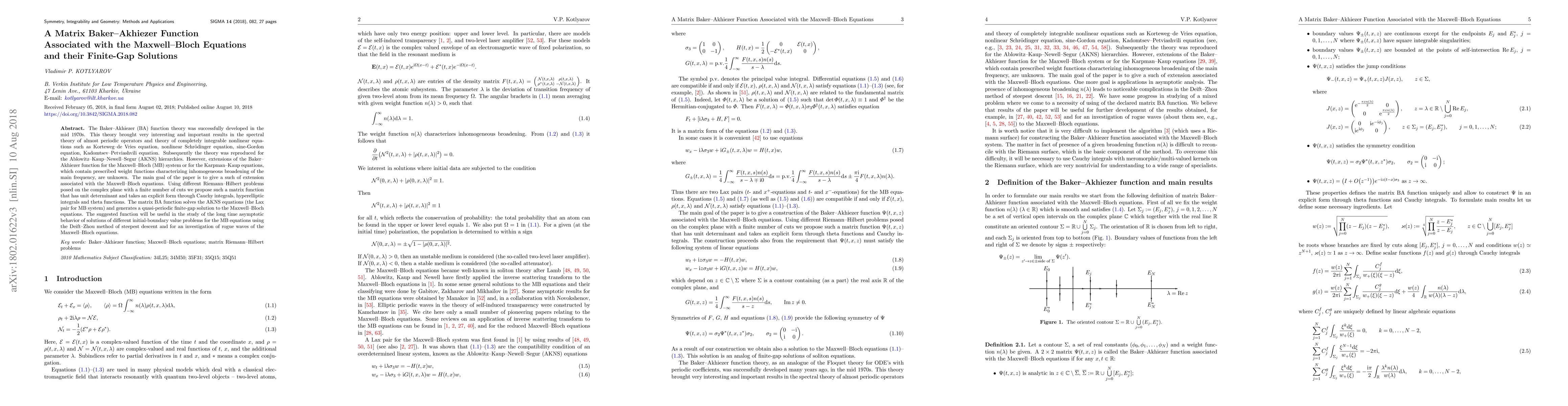 This paper extends the Baker-Akhiezer function theory to the Maxwell-Bloch equations, introducing a matrix function that solves the AKNS equations and generates quasi-periodic finite-gap solutions. The proposed function, defined via Riemann-Hilbert problems, is expected to aid in studying the long-term behavior and rogue waves of the Maxwell-Bloch system.