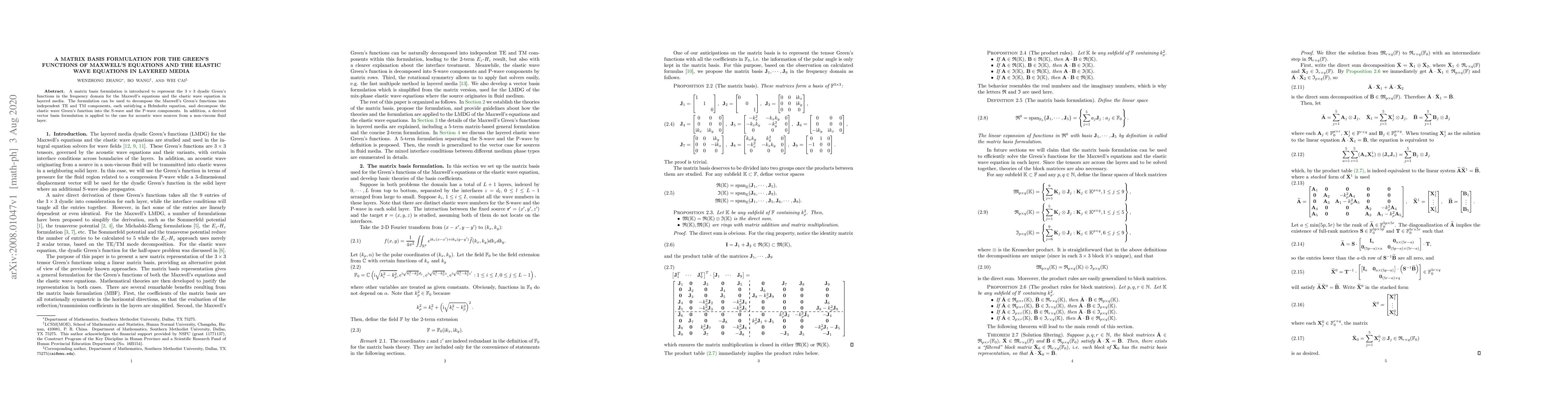 A matrix basis formulation is introduced to represent the 3 x 3 dyadic Green's functions in the frequency domain for the Maxwell's equations and the elastic wave equation in layered media. The formulation can be used to decompose the Maxwell's Green's functions into independent TE and TM components, each satisfying a Helmholtz equation, and decompose the elastic wave Green's function into the S-wave and the P-wave components. In addition, a derived vector basis formulation is applied to the case for acoustic wave sources from a non-viscous fluid layer.
