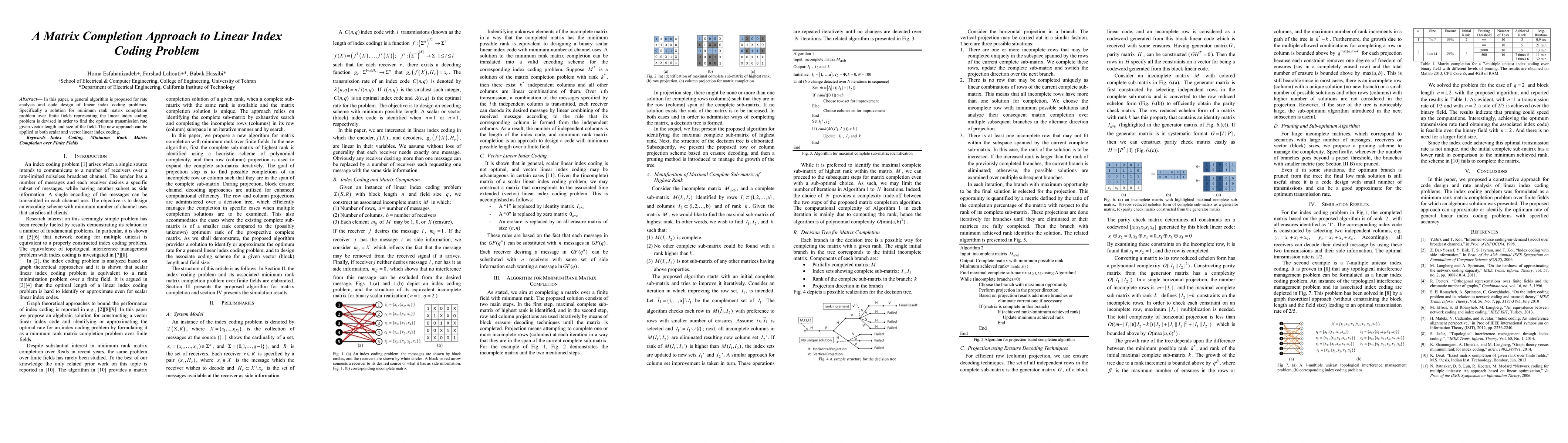 Summary: This paper proposes a matrix completion algorithm for linear index coding, addressing the minimum rank matrix completion problem over finite fields to determine the optimal transmission rate. The method is applicable to both scalar and vector linear index coding scenarios.