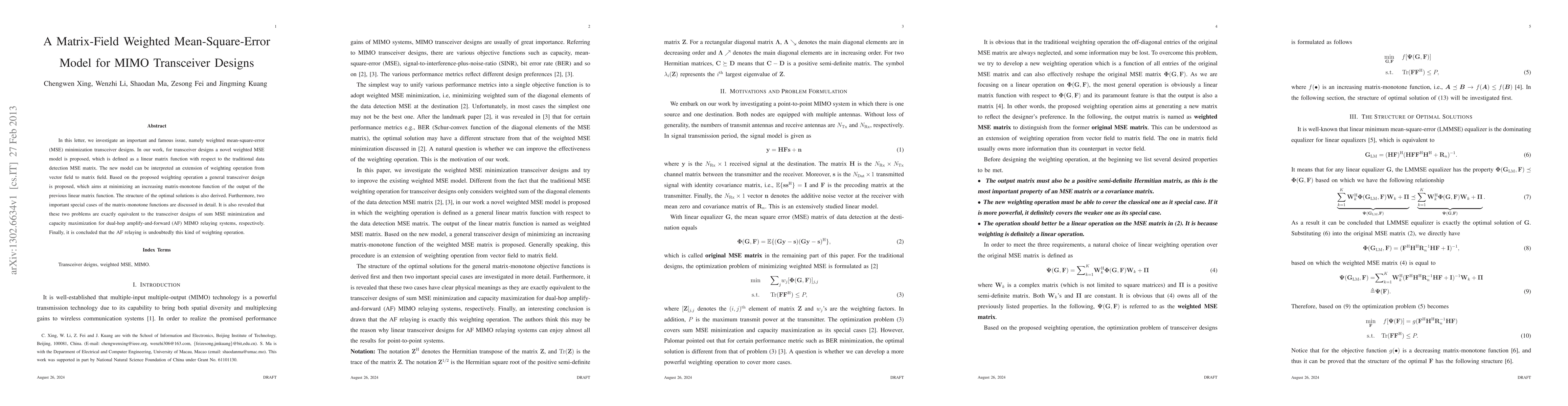 This paper proposes a new matrix-field weighted mean-square-error model for MIMO transceiver designs, aiming to minimize a matrix-monotone function. The model extends traditional weighting operations and leads to optimal transceiver solutions, with special cases relating to sum MSE minimization and capacity maximization in dual-hop AF MIMO relaying systems.