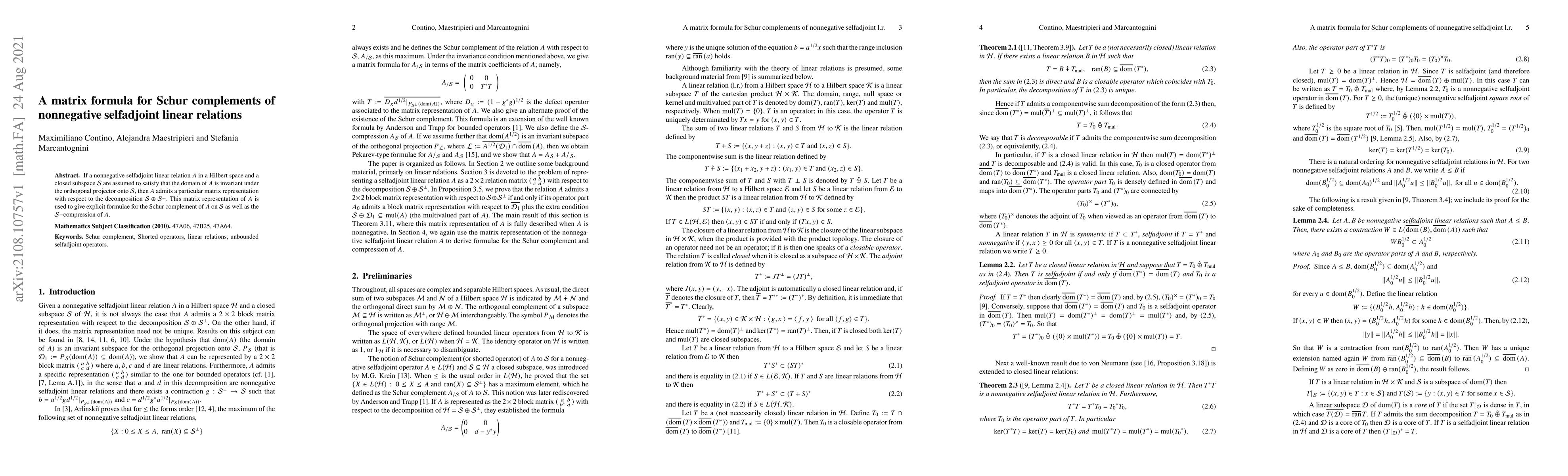 The paper presents a matrix formula for Schur complements of nonnegative selfadjoint linear relations under a specific subspace condition. It provides explicit formulae for the Schur complement and the subspace compression using a particular matrix representation of the relation.