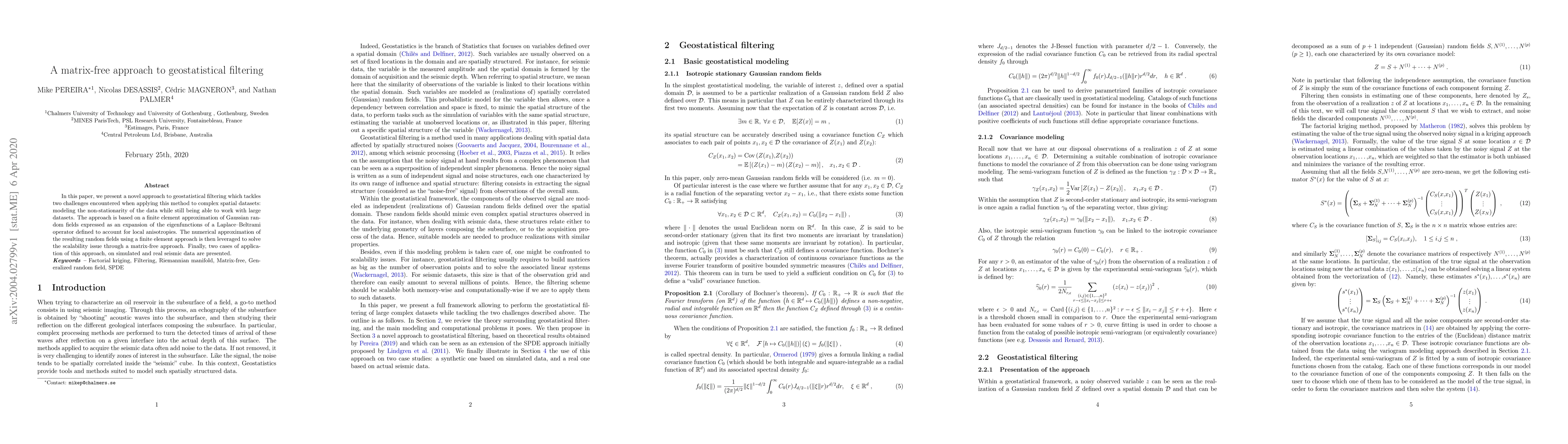This paper introduces a new method for geostatistical filtering, addressing non-stationarity in complex spatial data and scalability for large datasets. It uses a matrix-free finite element approximation of Gaussian random fields, effectively applied to simulated and real seismic data.