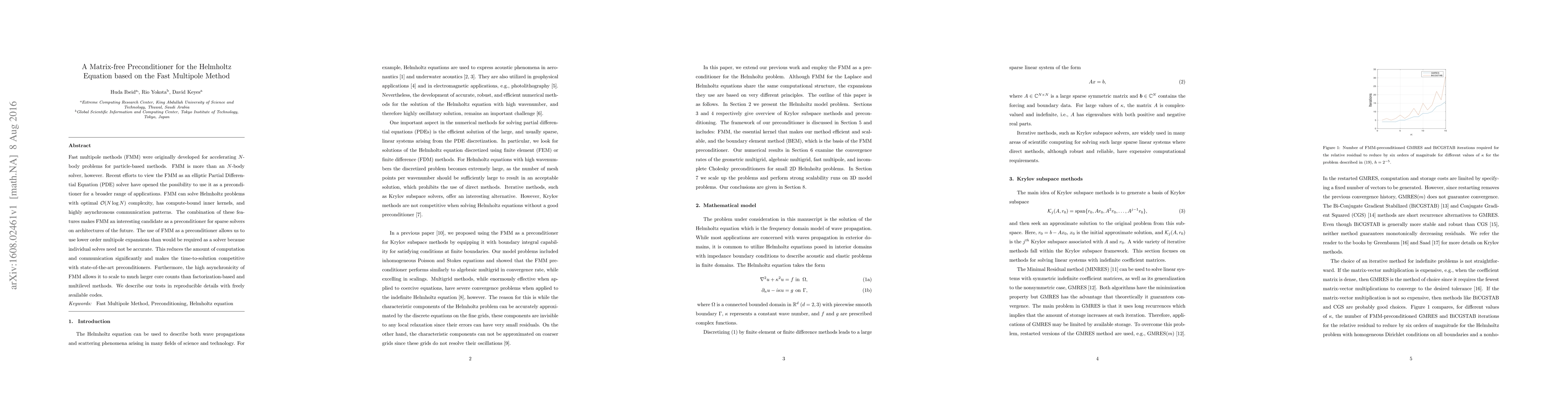 Fast multipole methods (FMM) were originally developed for accelerating $N$-body problems for particle-based methods. FMM is more than an $N$-body solver, however. Recent efforts to view the FMM as an elliptic Partial Differential Equation (PDE) solver have opened the possibility to use it as a preconditioner for a broader range of applications. FMM can solve Helmholtz problems with optimal $\mathcal{O}(N \log N)$ complexity, has compute-bound inner kernels, and highly asynchronous communication patterns. The combination of these features makes FMM an interesting candidate as a preconditioner for sparse solvers on architectures of the future. The use of FMM as a preconditioner allows us to use lower order multipole expansions than would be required as a solver because individual solves need not be accurate. This reduces the amount of computation and communication significantly and makes the time-to-solution competitive with state-of-the-art preconditioners. Furthermore, the high asynchronicity of FMM allows it to scale to much larger core counts than factorization-based and multilevel methods. We describe our tests in reproducible details with freely available codes.