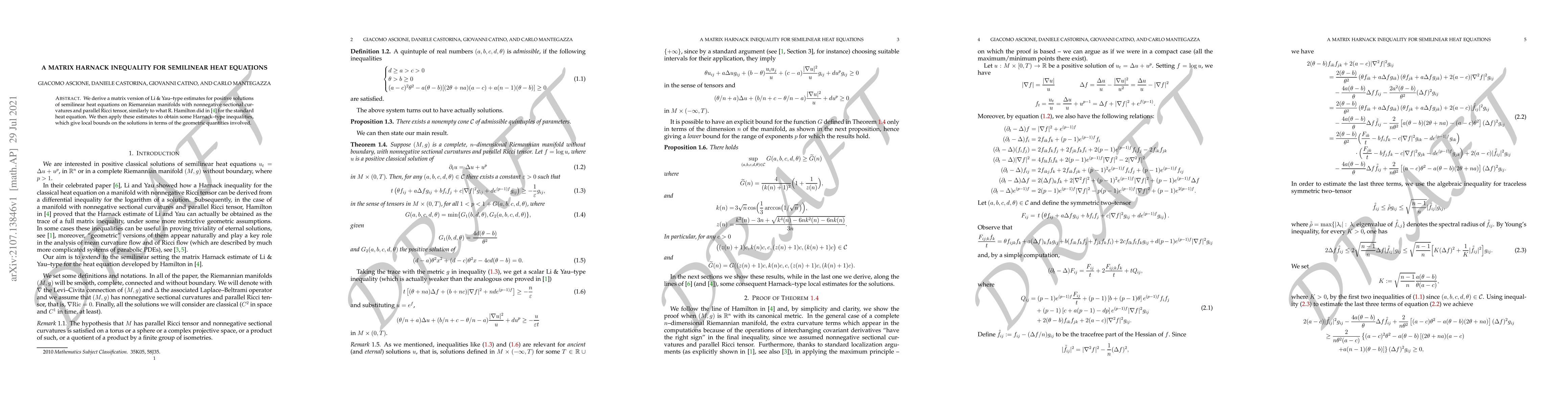 We derive a matrix version of Li \& Yau--type estimates for positive solutions of semilinear heat equations on Riemannian manifolds with nonnegative sectional curvatures and parallel Ricci tensor, similarly to what R.~Hamilton did in~\cite{hamilton7} for the standard heat equation. We then apply these estimates to obtain some Harnack--type inequalities, which give local bounds on the solutions in terms of the geometric quantities involved.