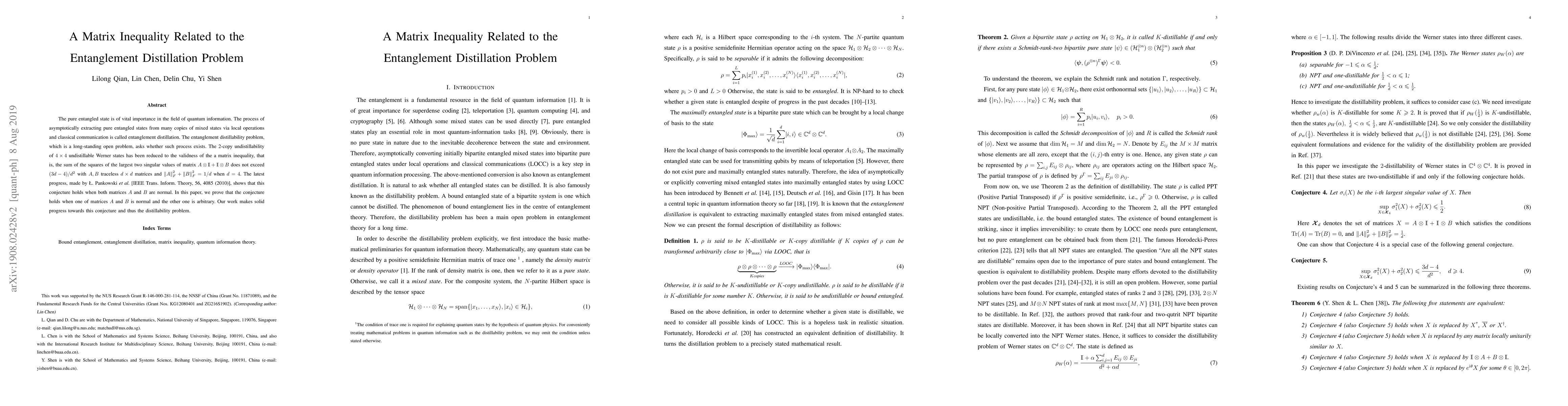 This paper proves that the conjectured matrix inequality holds when one of two matrices is normal and the other is arbitrary, advancing progress on the entanglement distillation problem and the longstanding question of whether pure entangled states can be distilled from mixed states.