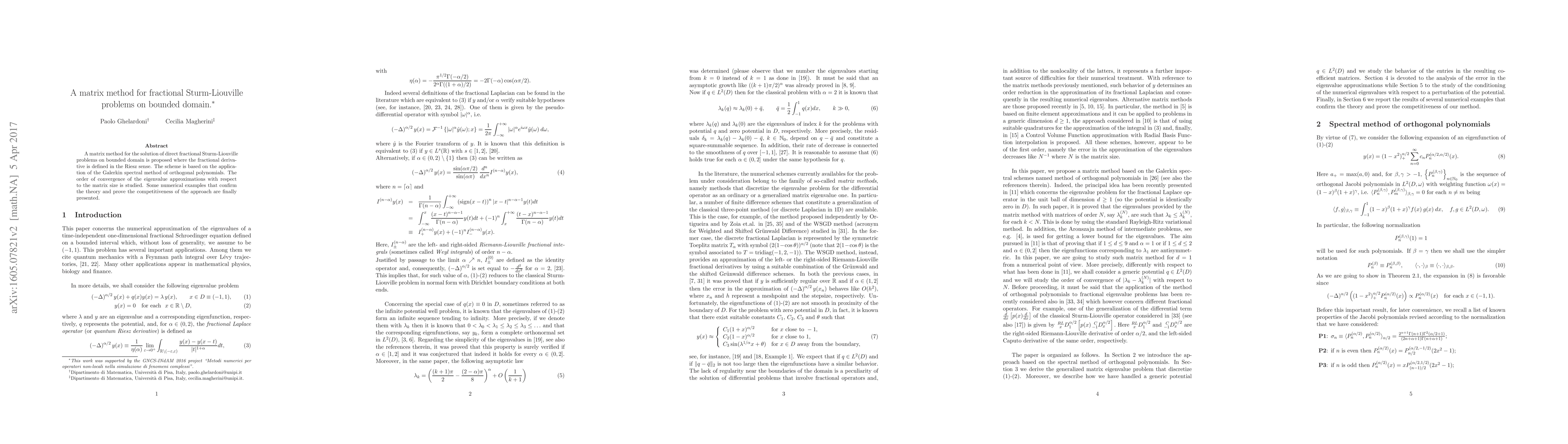 A matrix method for the solution of direct fractional Sturm-Liouville problems on bounded domain is proposed where the fractional derivative is defined in the Riesz sense. The scheme is based on the application of the Galerkin spectral method of orthogonal polynomials. The order of convergence of the eigenvalue approximations with respect to the matrix size is studied. Some numerical examples that confirm the theory and prove the competitiveness of the approach are finally presented.