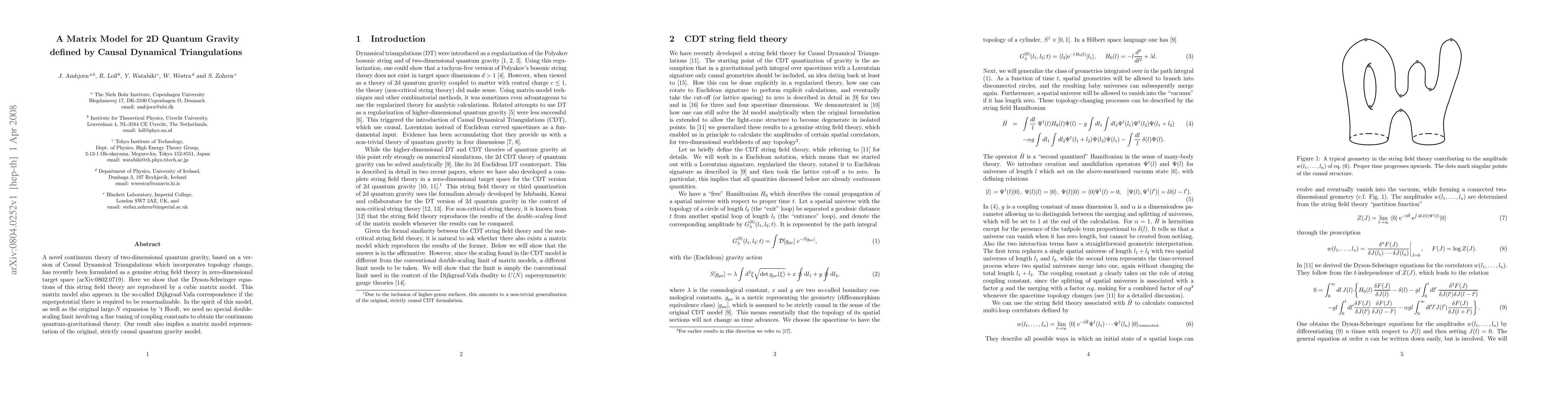 This paper presents a matrix model that reproduces the Dyson-Schwinger equations of a novel string field theory for 2D quantum gravity based on Causal Dynamical Triangulations, offering a continuum theory without requiring special double-scaling limits. The matrix model also aligns with the Dijkgraaf-Vafa correspondence under renormalizable superpotential conditions.