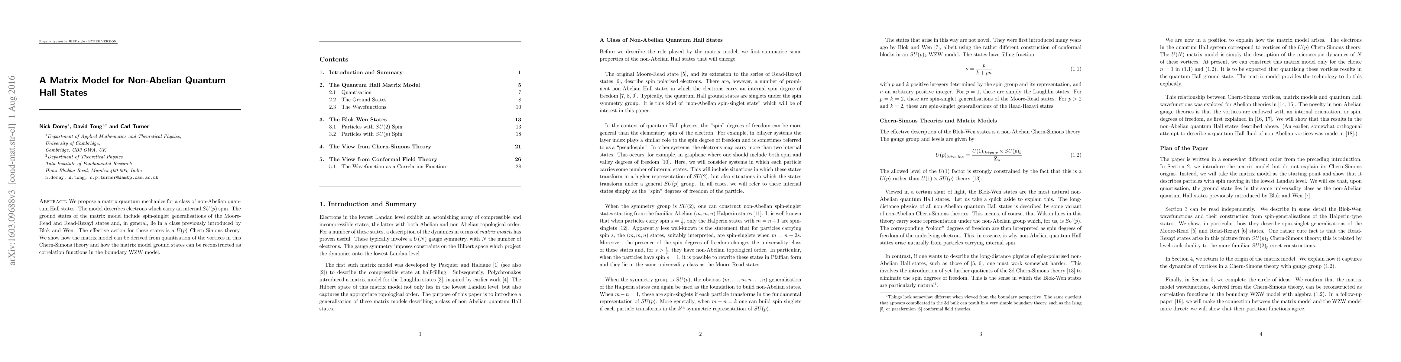 This paper proposes a matrix quantum mechanics model for non-Abelian quantum Hall states, describing electrons with SU(p) spin and identifying ground states as spin-singlet generalizations of Moore-Read and Read-Rezayi states. The effective action is a U(p) Chern-Simons theory, derived from vortex quantization, with the matrix model's ground states reconstructed via boundary WZW model correlation functions.