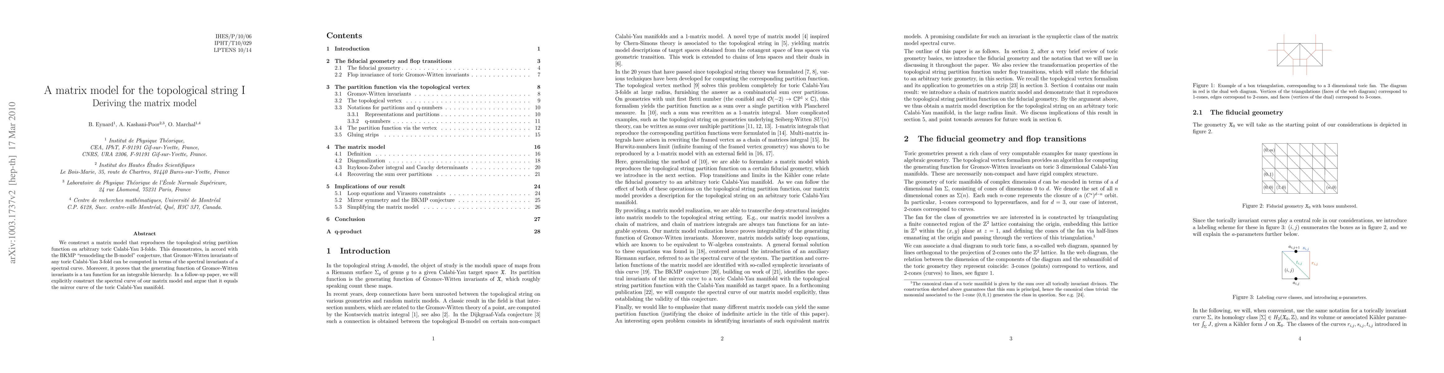 We construct a matrix model that reproduces the topological string partition function on arbitrary toric Calabi-Yau 3-folds. This demonstrates, in accord with the BKMP "remodeling the B-model" conjecture, that Gromov-Witten invariants of any toric Calabi-Yau 3-fold can be computed in terms of the spectral invariants of a spectral curve. Moreover, it proves that the generating function of Gromov-Witten invariants is a tau function for an integrable hierarchy. In a follow-up paper, we will explicitly construct the spectral curve of our matrix model and argue that it equals the mirror curve of the toric Calabi-Yau manifold.
