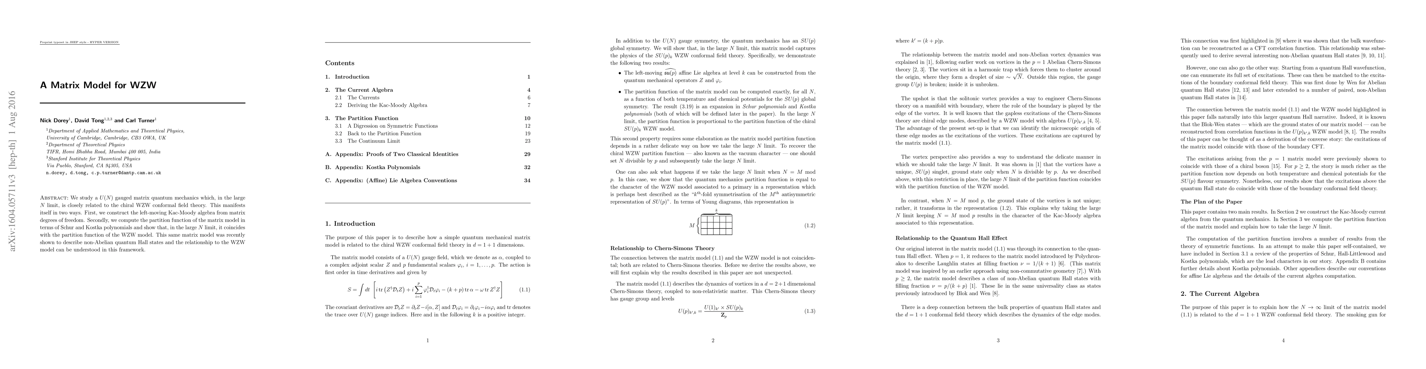 This paper explores a U(N) gauged matrix quantum mechanics that relates to the chiral WZW conformal field theory in the large N limit, constructing the left-moving Kac-Moody algebra from matrix degrees of freedom and computing the partition function in terms of Schur and Kostka polynomials, which aligns with the WZW model's partition function. The matrix model also describes non-Abelian quantum Hall states.