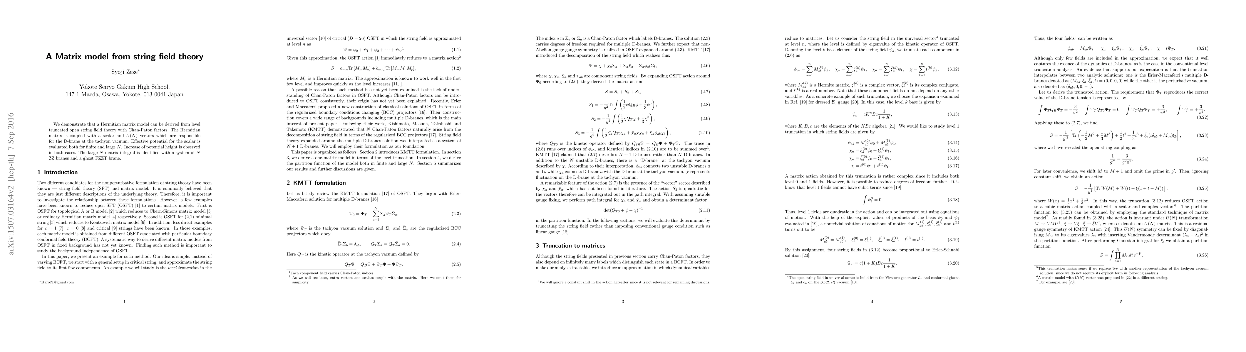 We demonstrate that a Hermitian matrix model can be derived from level truncated open string field theory with Chan-Paton factors. The Hermitian matrix is coupled with a scalar and a $U(N)$ vector which are responsible for the D-brane at the tachyon vacuum. Effective potential for the scalar is evaluated both in finite and large $N$. Increase of potential height is observed in both examples. The large $N$ matrix integral is identified with a system of $N$ ZZ branes and a ghost FZZT brane.