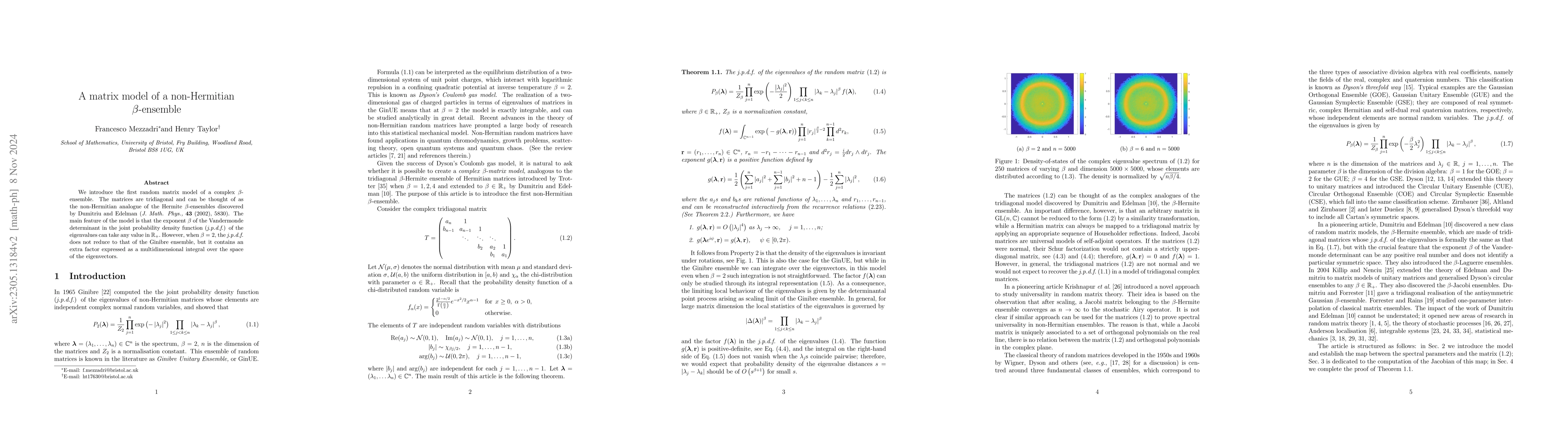 This paper introduces a novel random matrix model for a non-Hermitian $\beta$-ensemble, featuring tridiagonal matrices as the non-Hermitian analogue of the Hermite $\beta$-ensembles. The model allows the exponent $\beta$ in the joint probability density function to vary over $\mathbb{R}_+$, with a unique structure when $\beta=2$ that includes an additional multidimensional integral factor.