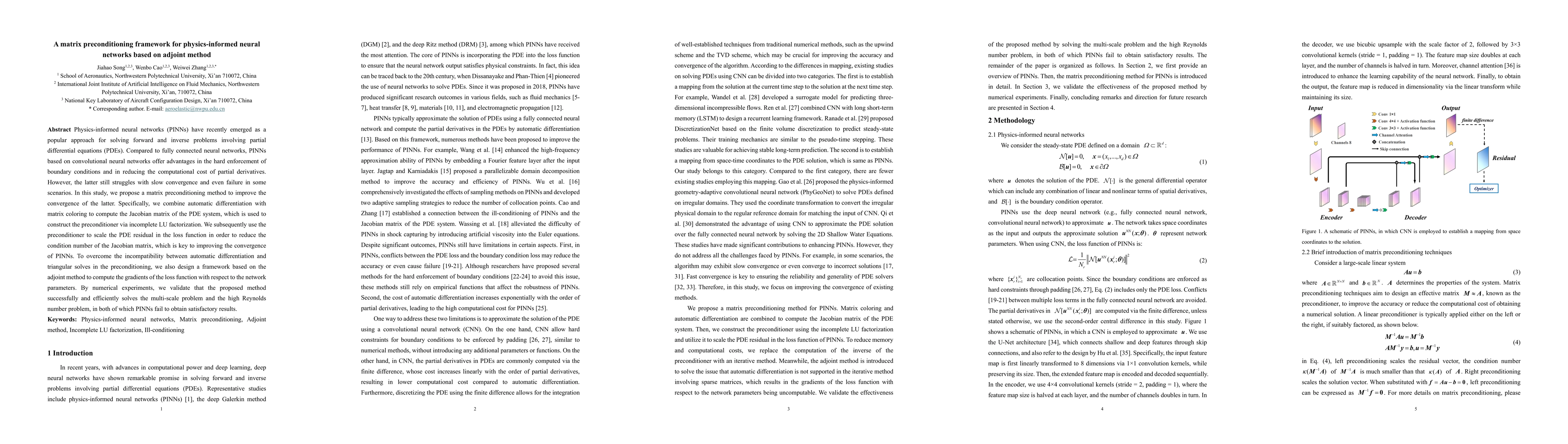 Physics-informed neural networks (PINNs) have recently emerged as a popular approach for solving forward and inverse problems involving partial differential equations (PDEs). Compared to fully connected neural networks, PINNs based on convolutional neural networks offer advantages in the hard enforcement of boundary conditions and in reducing the computational cost of partial derivatives. However, the latter still struggles with slow convergence and even failure in some scenarios. In this study, we propose a matrix preconditioning method to improve the convergence of the latter. Specifically, we combine automatic differentiation with matrix coloring to compute the Jacobian matrix of the PDE system, which is used to construct the preconditioner via incomplete LU factorization. We subsequently use the preconditioner to scale the PDE residual in the loss function in order to reduce the condition number of the Jacobian matrix, which is key to improving the convergence of PINNs. To overcome the incompatibility between automatic differentiation and triangular solves in the preconditioning, we also design a framework based on the adjoint method to compute the gradients of the loss function with respect to the network parameters. By numerical experiments, we validate that the proposed method successfully and efficiently solves the multi-scale problem and the high Reynolds number problem, in both of which PINNs fail to obtain satisfactory results.