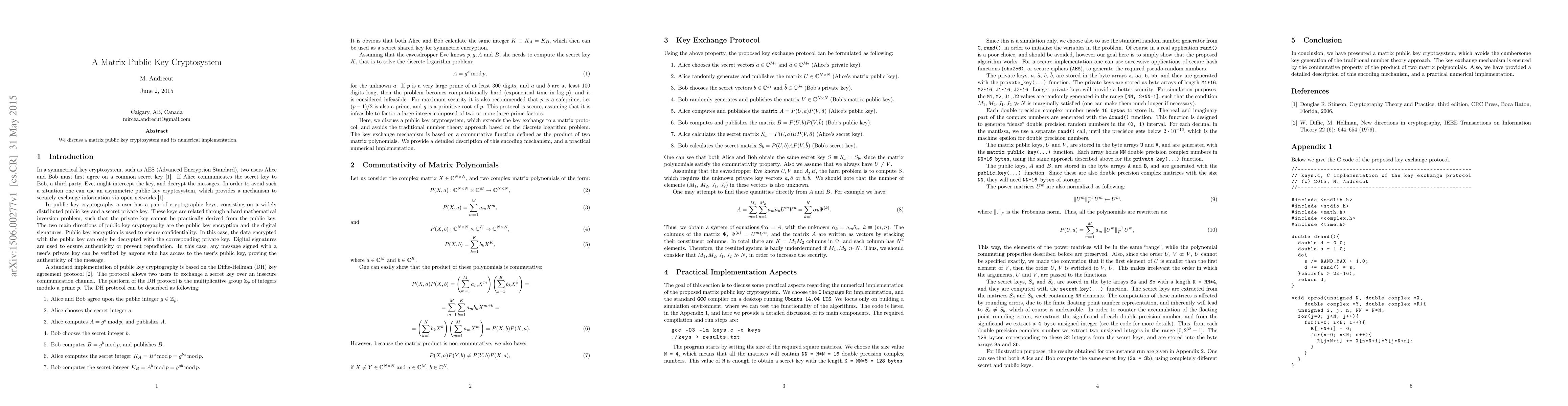 Summary: This paper introduces a novel matrix-based public key cryptosystem and provides a detailed numerical implementation to demonstrate its effectiveness and security. The system aims to enhance cryptographic protocols through matrix operations.