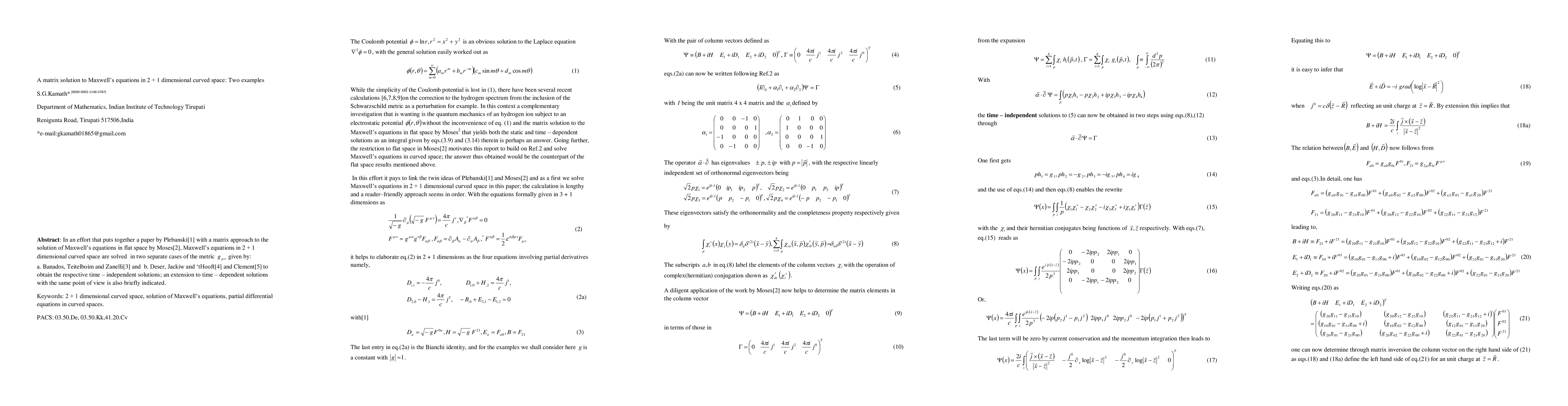 Researchers solved Maxwell's equations in 2+1 dimensional curved space using a matrix approach, providing time-independent solutions for two different metrics, with implications for understanding gravity and electromagnetism.