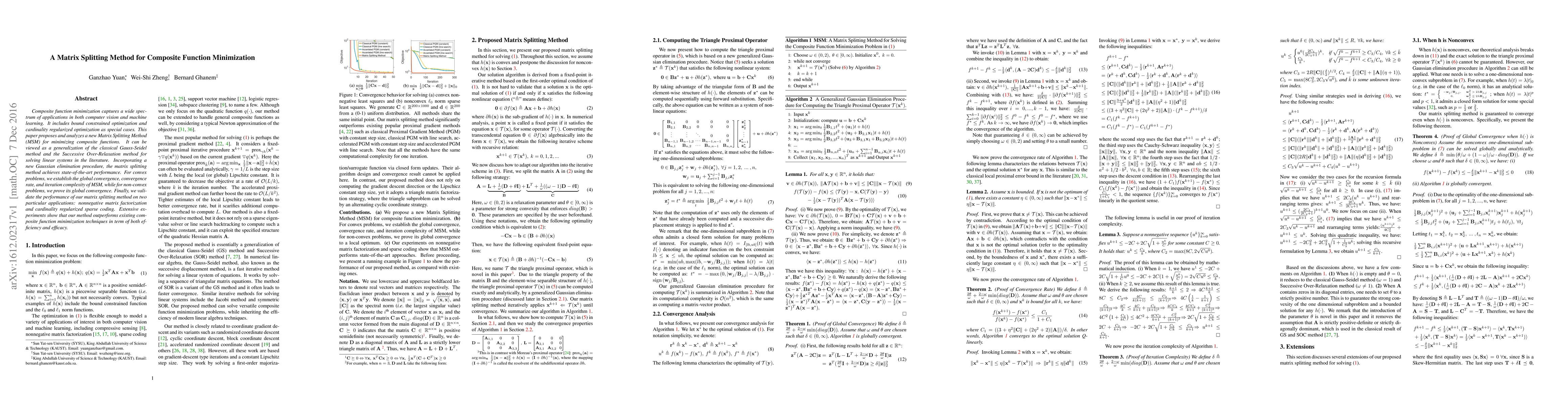 Composite function minimization captures a wide spectrum of applications in both computer vision and machine learning. It includes bound constrained optimization and cardinality regularized optimization as special cases. This paper proposes and analyzes a new Matrix Splitting Method (MSM) for minimizing composite functions. It can be viewed as a generalization of the classical Gauss-Seidel method and the Successive Over-Relaxation method for solving linear systems in the literature. Incorporating a new Gaussian elimination procedure, the matrix splitting method achieves state-of-the-art performance. For convex problems, we establish the global convergence, convergence rate, and iteration complexity of MSM, while for non-convex problems, we prove its global convergence. Finally, we validate the performance of our matrix splitting method on two particular applications: nonnegative matrix factorization and cardinality regularized sparse coding. Extensive experiments show that our method outperforms existing composite function minimization techniques in term of both efficiency and efficacy.