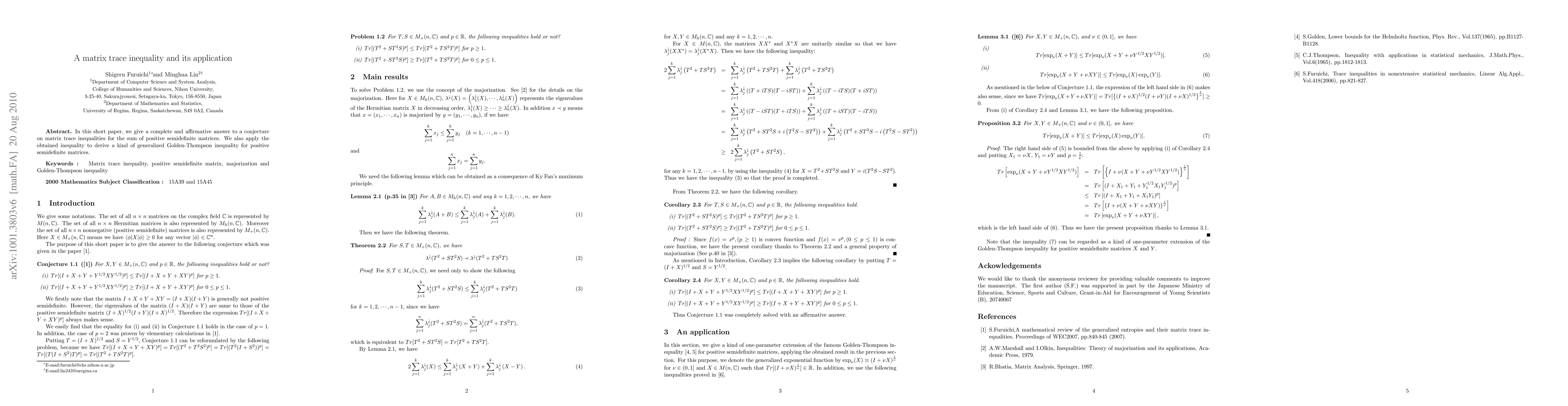 Summary: This paper confirms a conjecture regarding matrix trace inequalities for sums of positive semidefinite matrices and utilizes the result to establish a generalized Golden-Thompson inequality for such matrices.