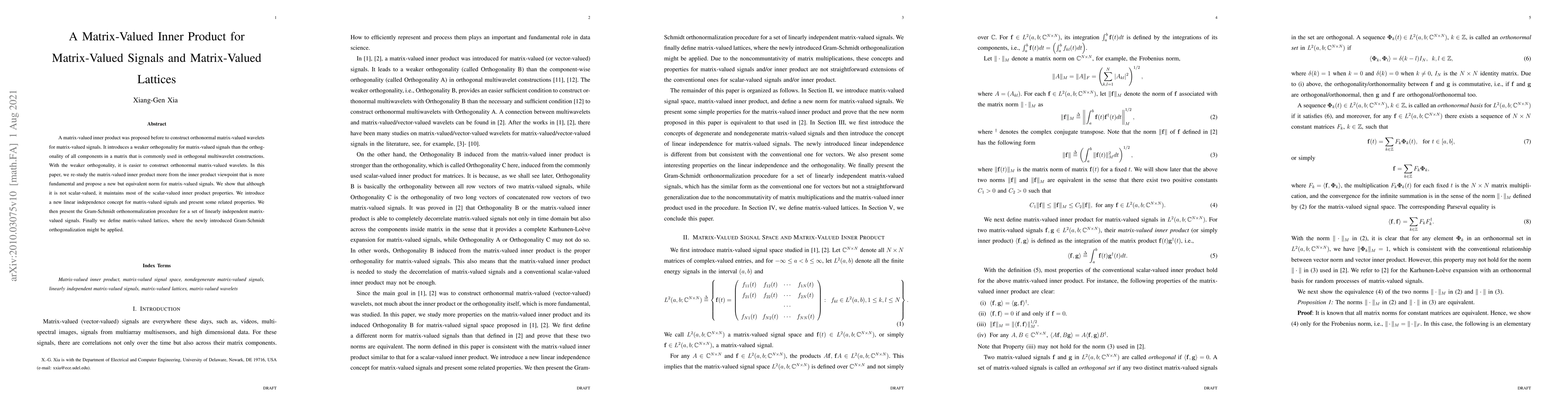 This paper revisits the matrix-valued inner product for constructing orthonormal matrix-valued wavelets, proposing a new norm that maintains scalar-inner product properties while being matrix-valued. It introduces a new linear independence concept and presents a Gram-Schmidt orthonormalization procedure for matrix-valued signals, followed by the definition of matrix-valued lattices.