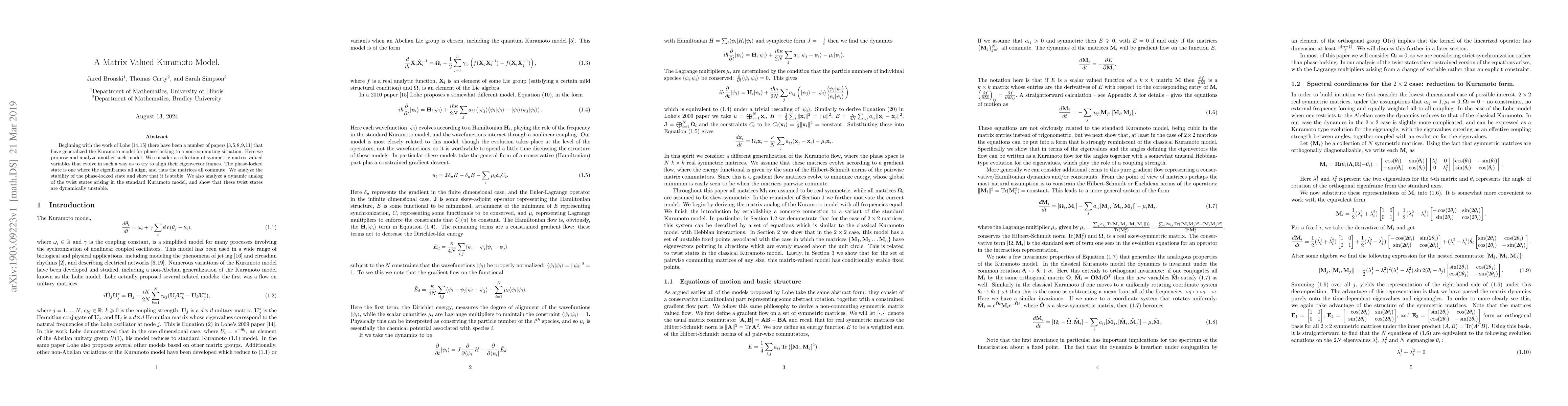 Beginning with the work of Lohe [14,15] there have been a number of papers [3,5,8,9,11] that have generalized the Kuramoto model for phase-locking to a non-commuting situation. Here we propose and analyze another such model. We consider a collection of symmetric matrix-valued variables that evolve in such a way as to try to align their eigenvector frames. The phase-locked state is one where the eigenframes all align, and thus the matrices all commute. We analyze the stability of the phase-locked state and show that it is stable. We also analyze a dynamic analog of the twist states arising in the standard Kuramoto model, and show that these twist states are dynamically unstable.