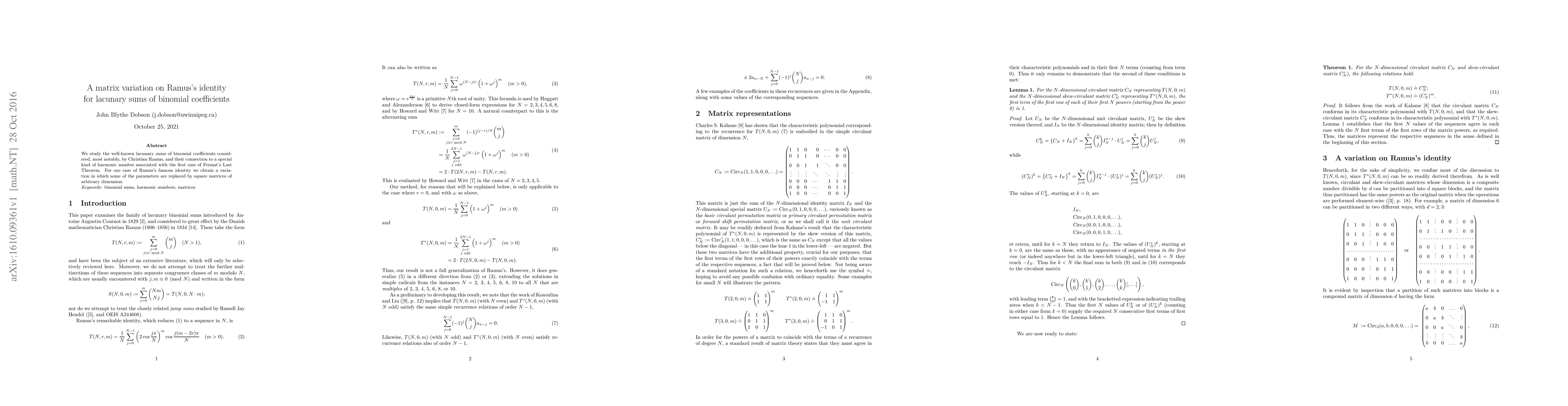 We study the well-known lacunary sums of binomial coefficients considered, most notably, by Christian Ramus, and their connection to a special kind of harmonic number associated with the first case of Fermat's Last Theorem. For one case of Ramus's famous identity we obtain a variation in which some of the parameters are replaced by square matrices of arbitrary dimension.