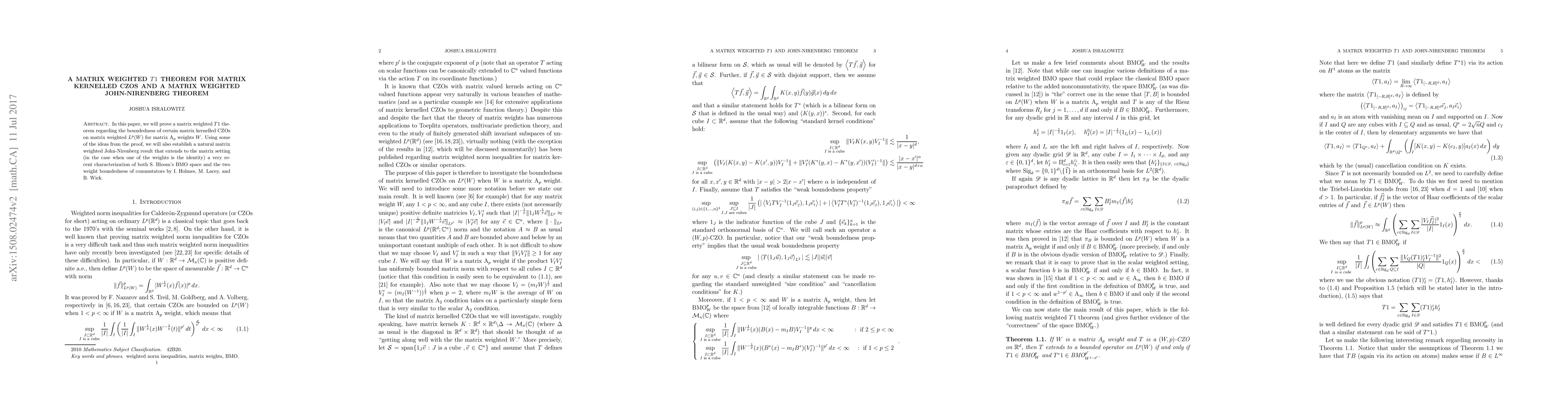 In this paper, we will prove a matrix weighted $T1$ theorem regarding the boundedness of certain matrix kernelled CZOs on matrix weighted $L^p(W)$ for matrix A${}_p$ weights $W$. Using some of the ideas from the proof, we will also establish a natural matrix weighted John-Nirenberg result that extends to the matrix setting (in the case when one of the weights is the identity) a very recent characterization of both S. Bloom's BMO space and the two weight boundedness of commutators by I. Holmes, M. Lacey, and B. Wick.