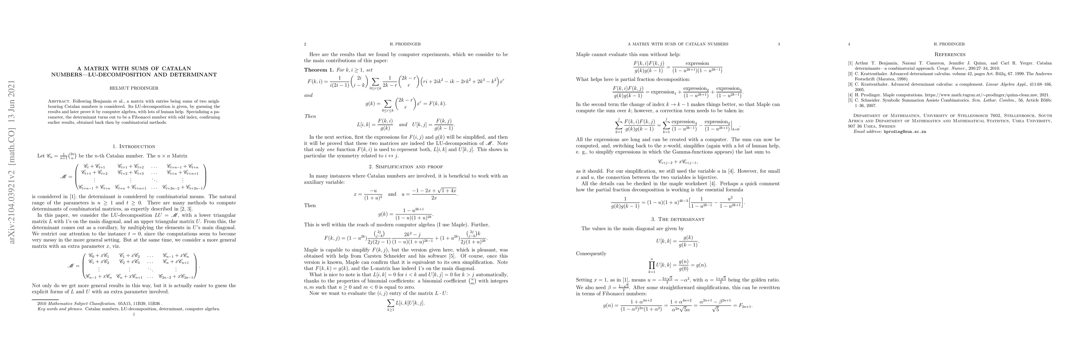 Following Benjamin et al., a matrix with entries being sums of two neighbouring Catalan numbers is considered. Its LU-decomposition is given, by guessing the results and later prove it by computer algebra, with lots of human help. Specializing a parameter, the determinant turns out to be a Fibonacci number with odd index, confirming earlier results, obtained back then by combinatorial methods.