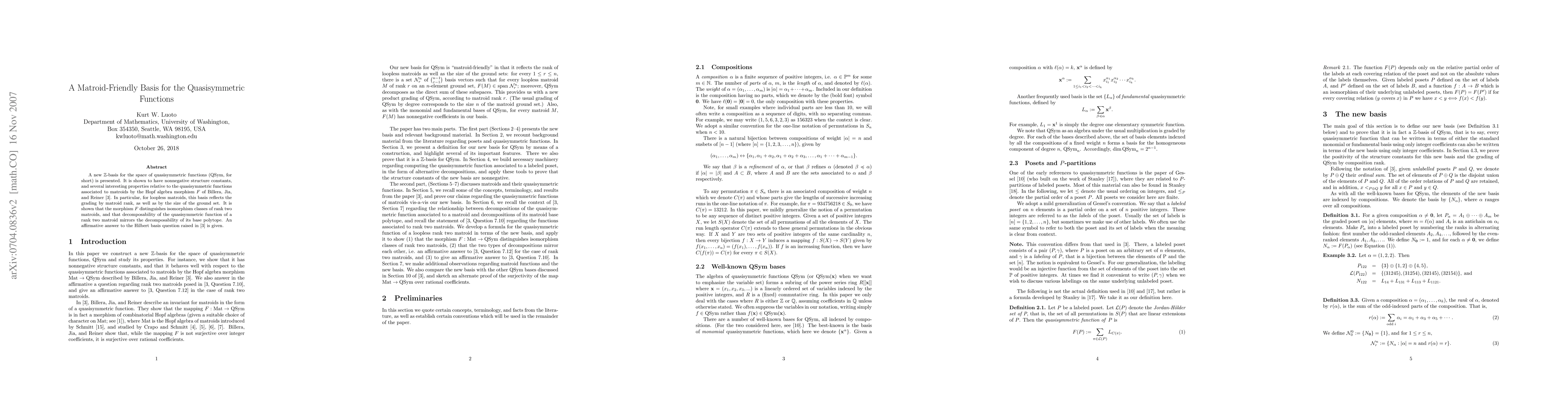 This paper presents a new Z-basis for quasisymmetric functions with nonnegative structure constants, which aligns with properties of matroids. It confirms the injectivity of the Hopf algebra morphism F for rank two matroids and resolves the Hilbert basis question for the associated quasisymmetric functions.