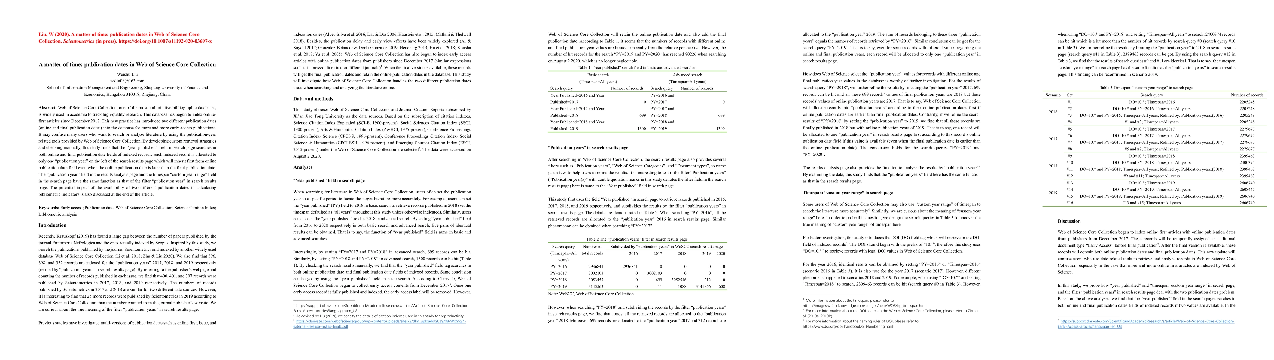 This study examines the impact of Web of Science Core Collection's indexing of online-first articles, which introduces two publication dates, leading to potential confusion in literature searches. It finds that the "year published" field prioritizes the online publication date, even when it precedes the final publication date, and discusses the implications for bibliometric analyses.