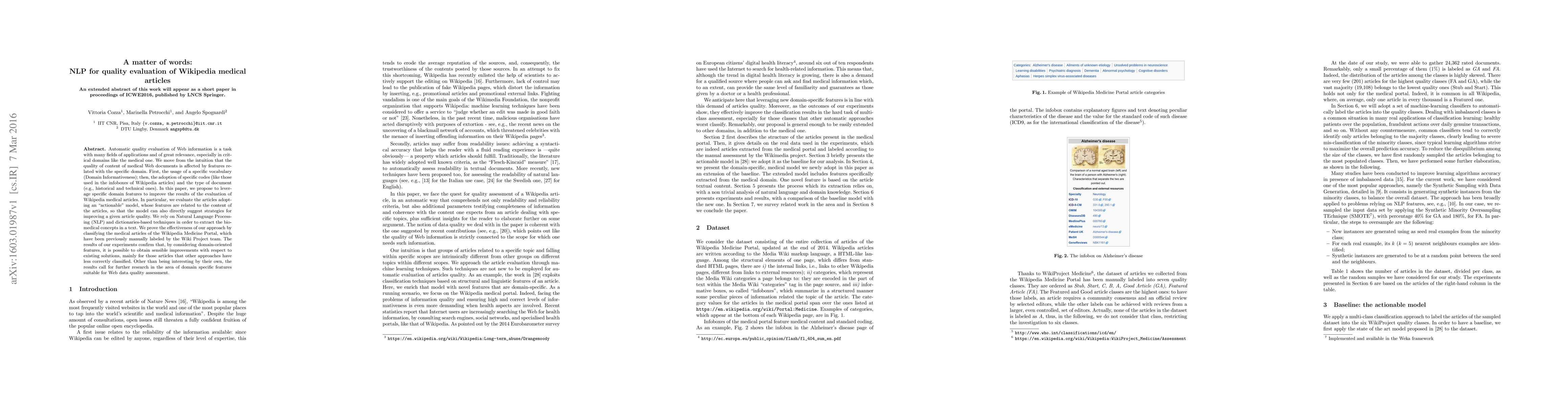 This paper proposes an NLP-based model to evaluate the quality of Wikipedia medical articles by leveraging domain-specific features, such as domain informativeness and infobox codes, to improve classification accuracy. The model suggests actionable strategies for article improvement, demonstrating better performance on the Wikipedia Medicine Portal articles compared to existing methods.